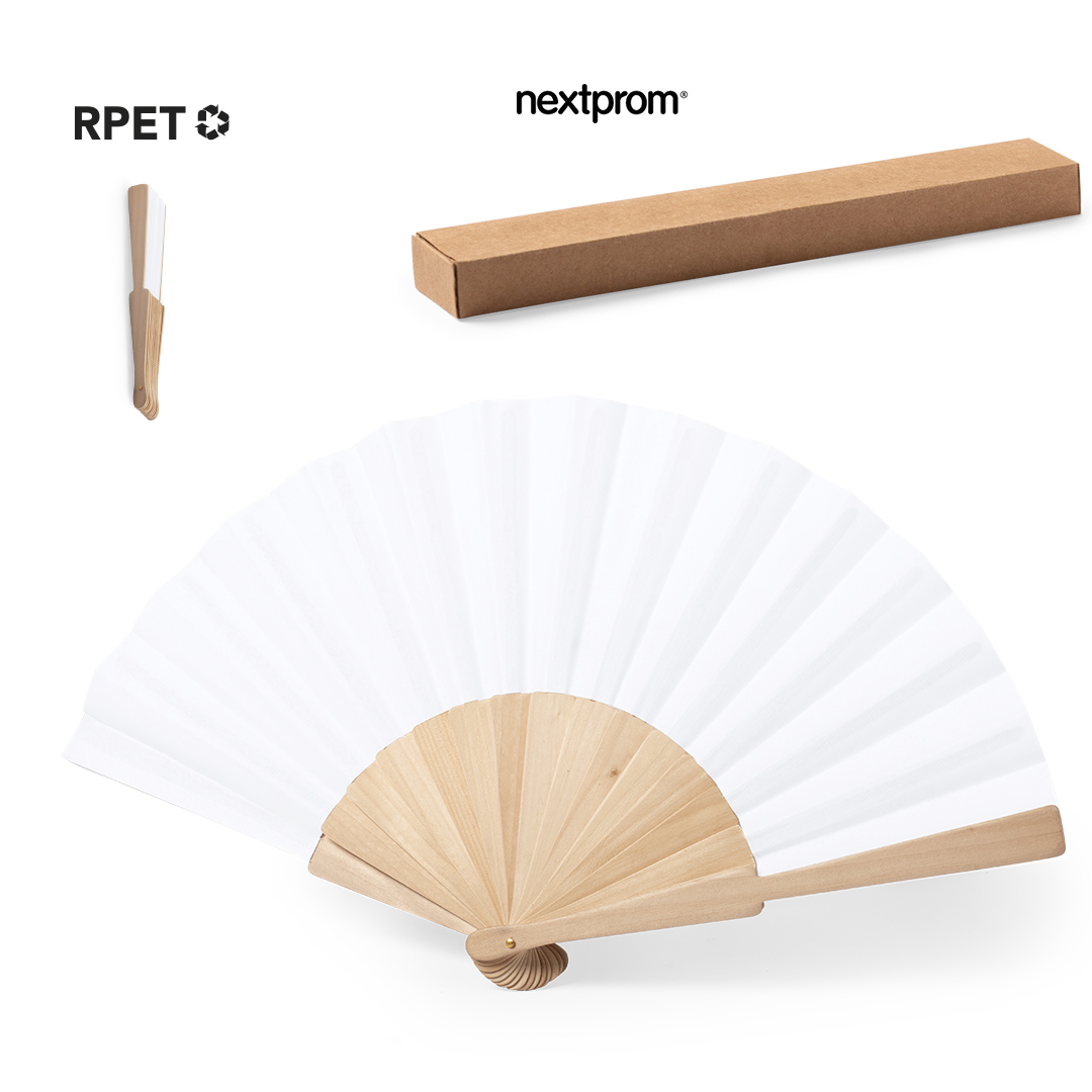 Abanico fabricado en tela reciclada RPET con elegante y  ecológica caja de cartón color natural.