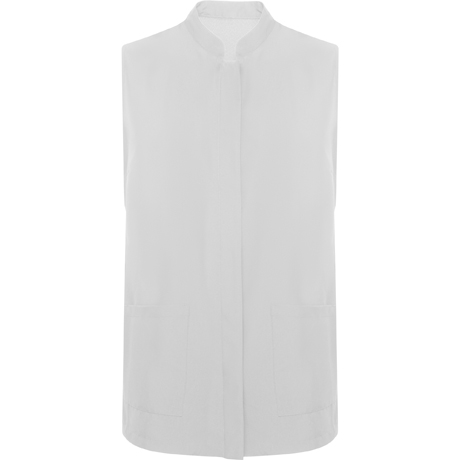 - Batas de mujer sin mangas con bolsillos frontales y cierre central con botones automáticos ocultos.