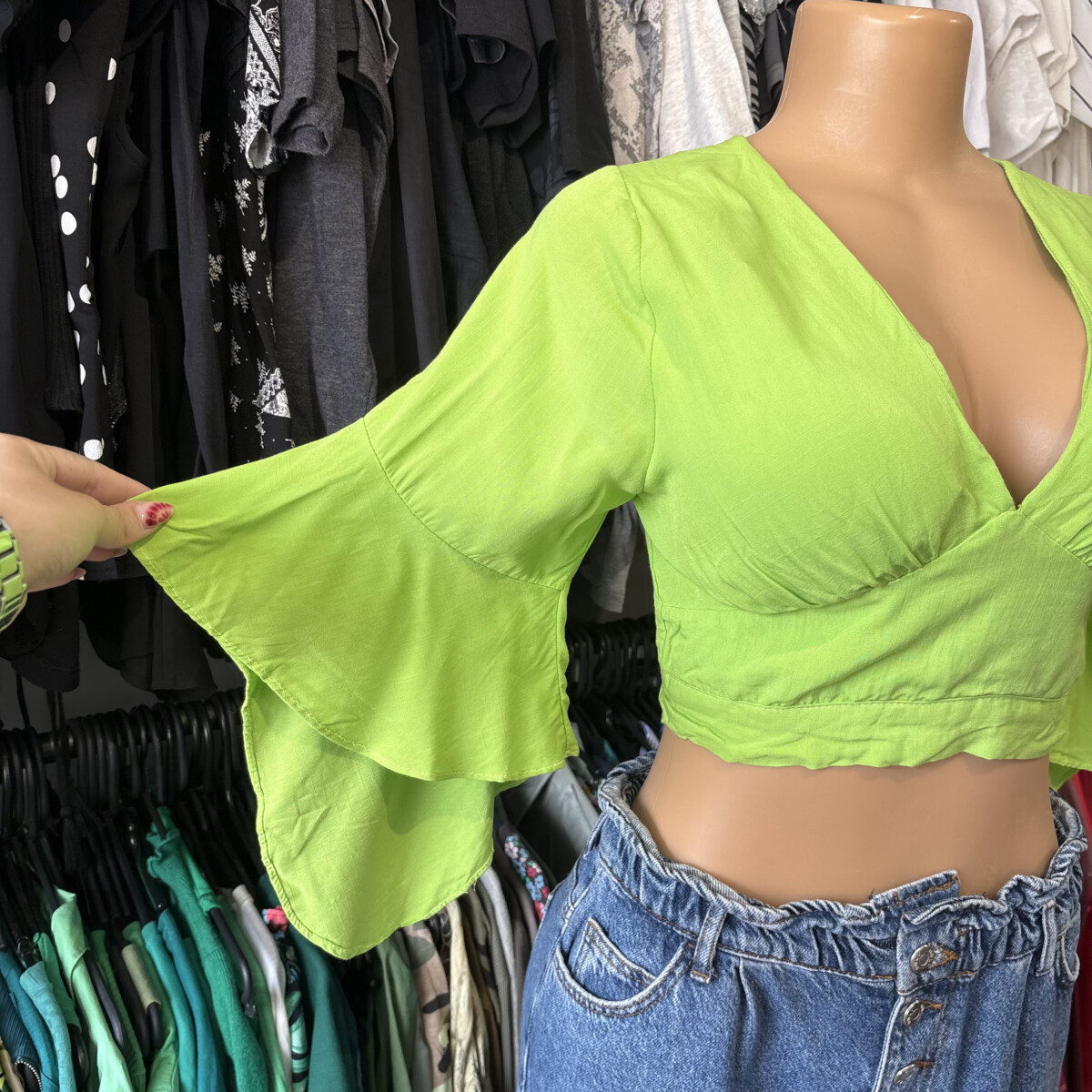 • Color verde, escote en V, manga ancha, atada atrás