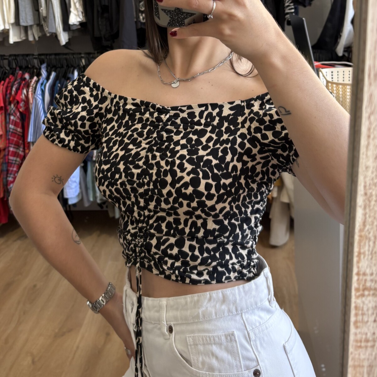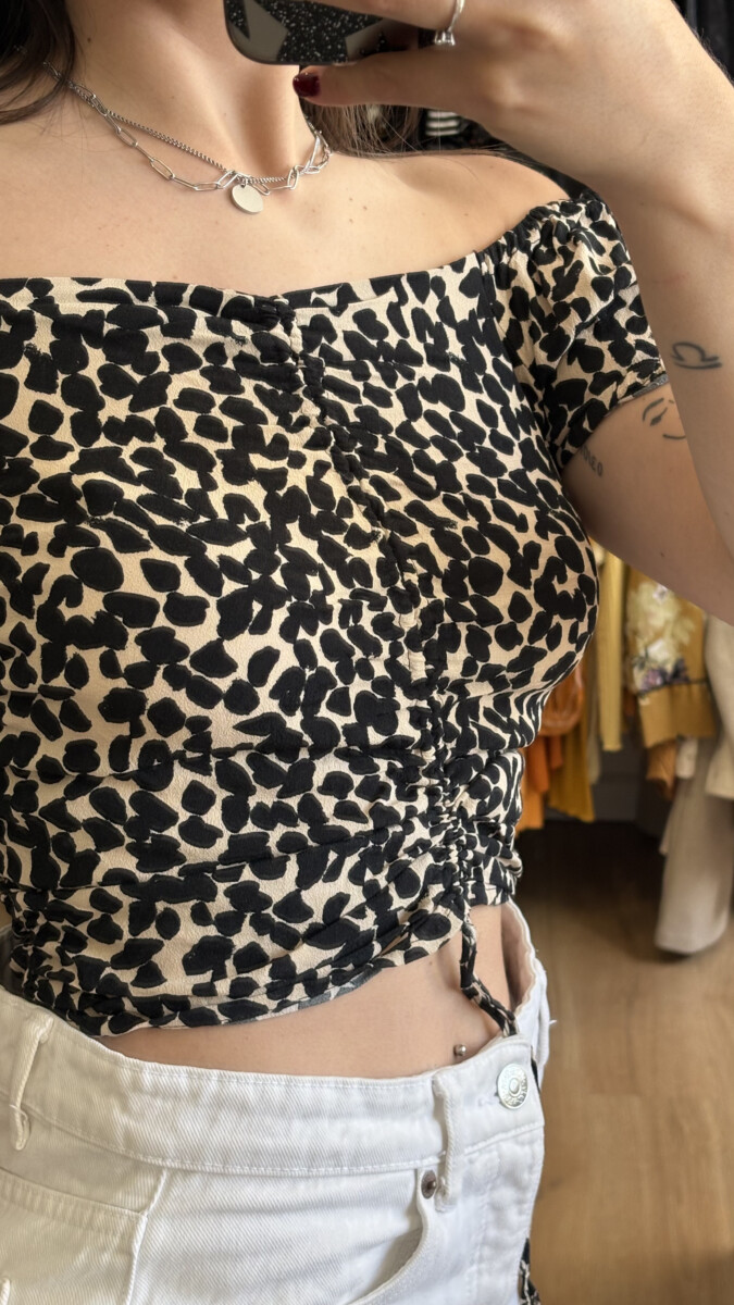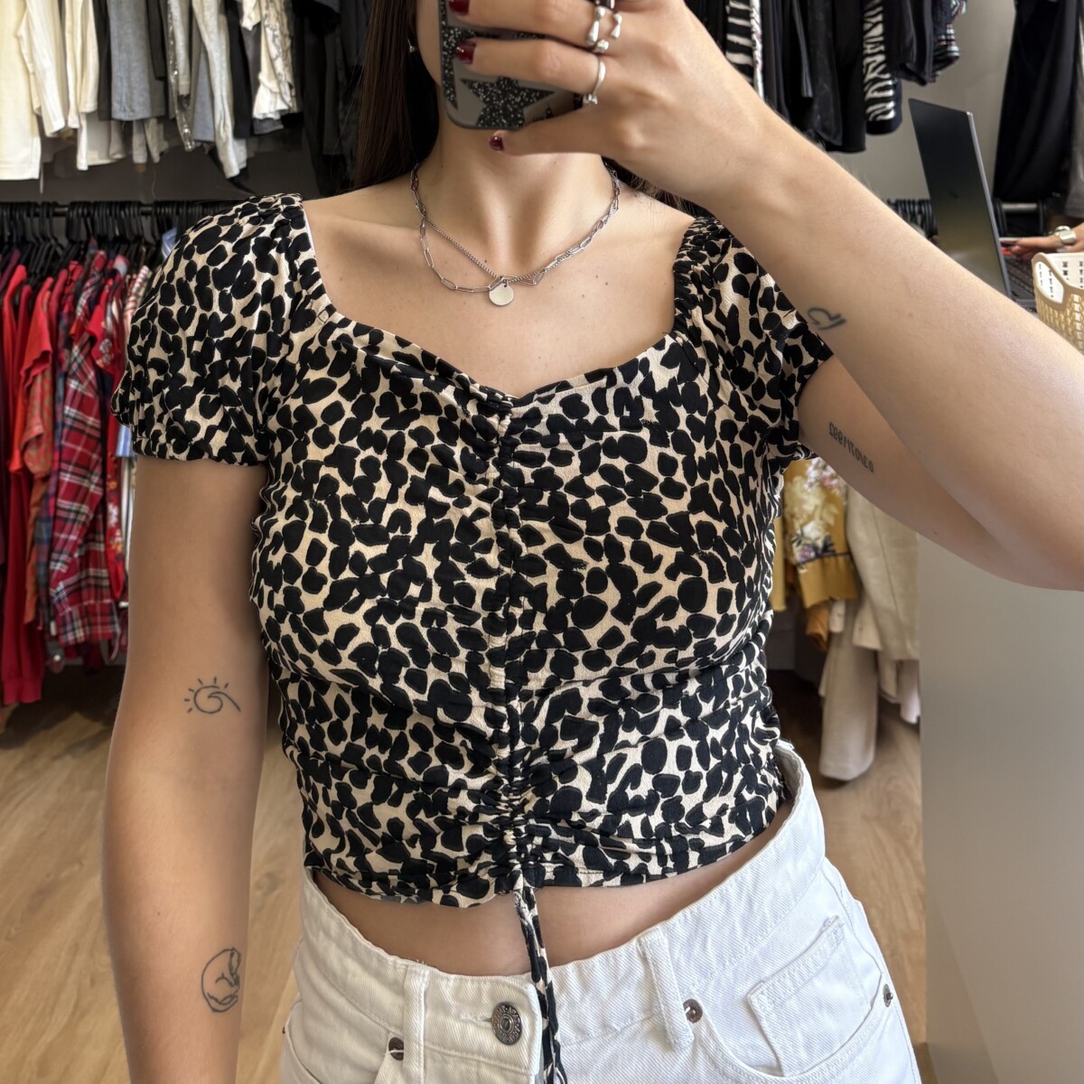 • Color beige con “manchitas” negras y frunce adelante ajustable
