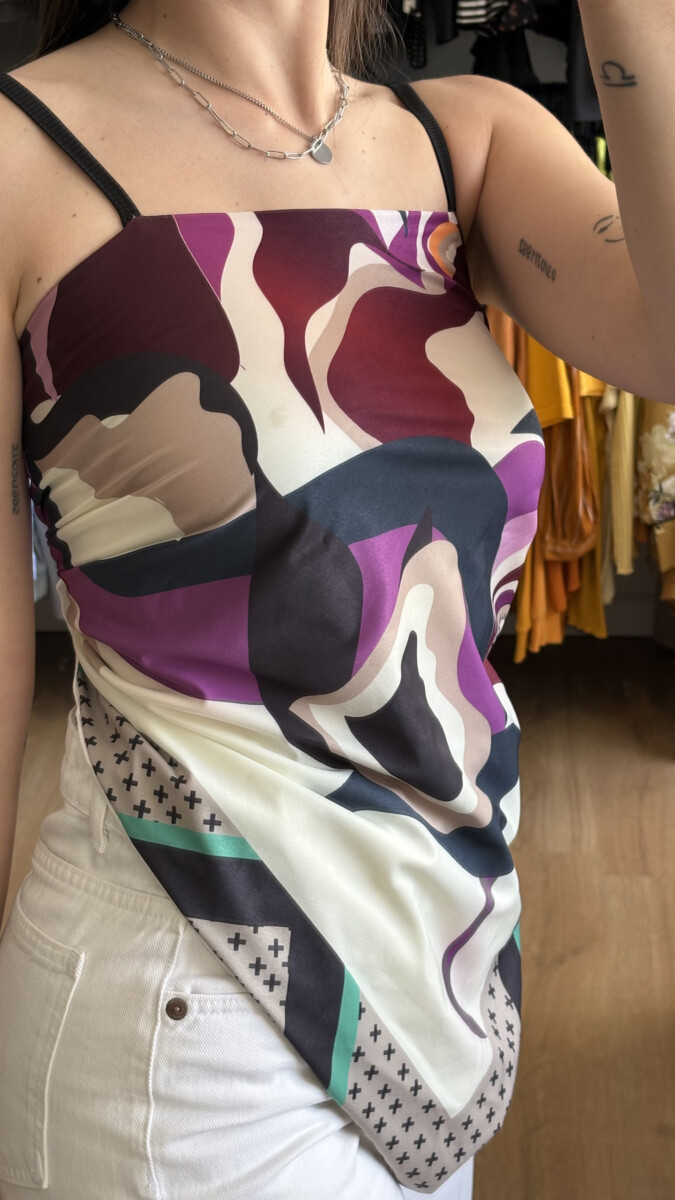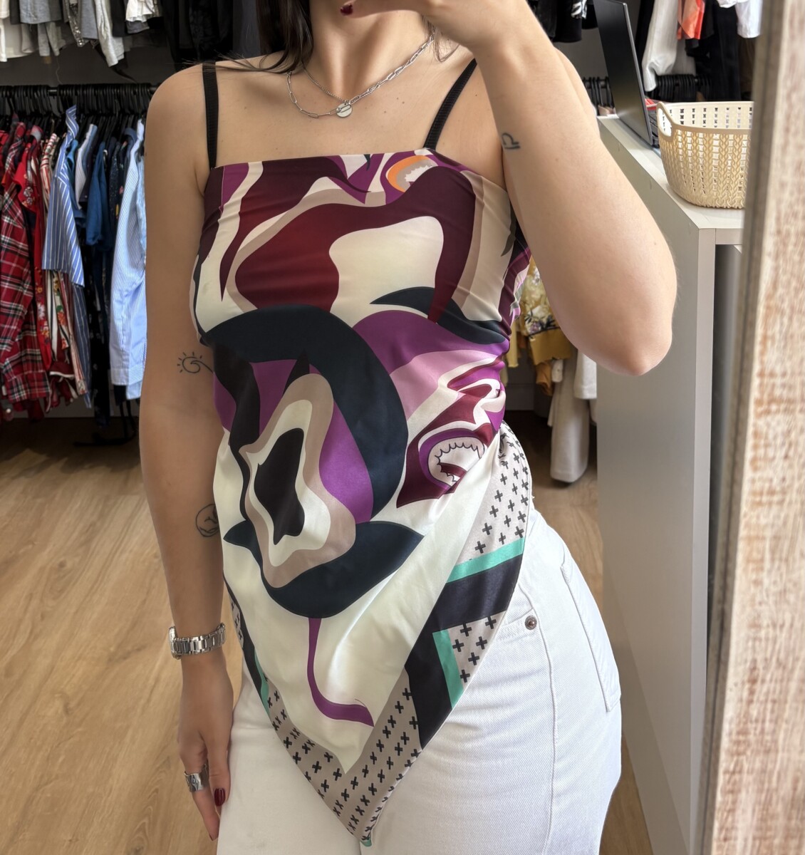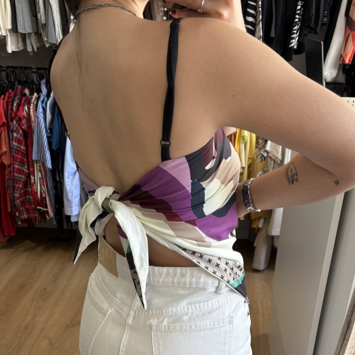• Blusa estilo pañuelo atada atrás, marca Mandinga