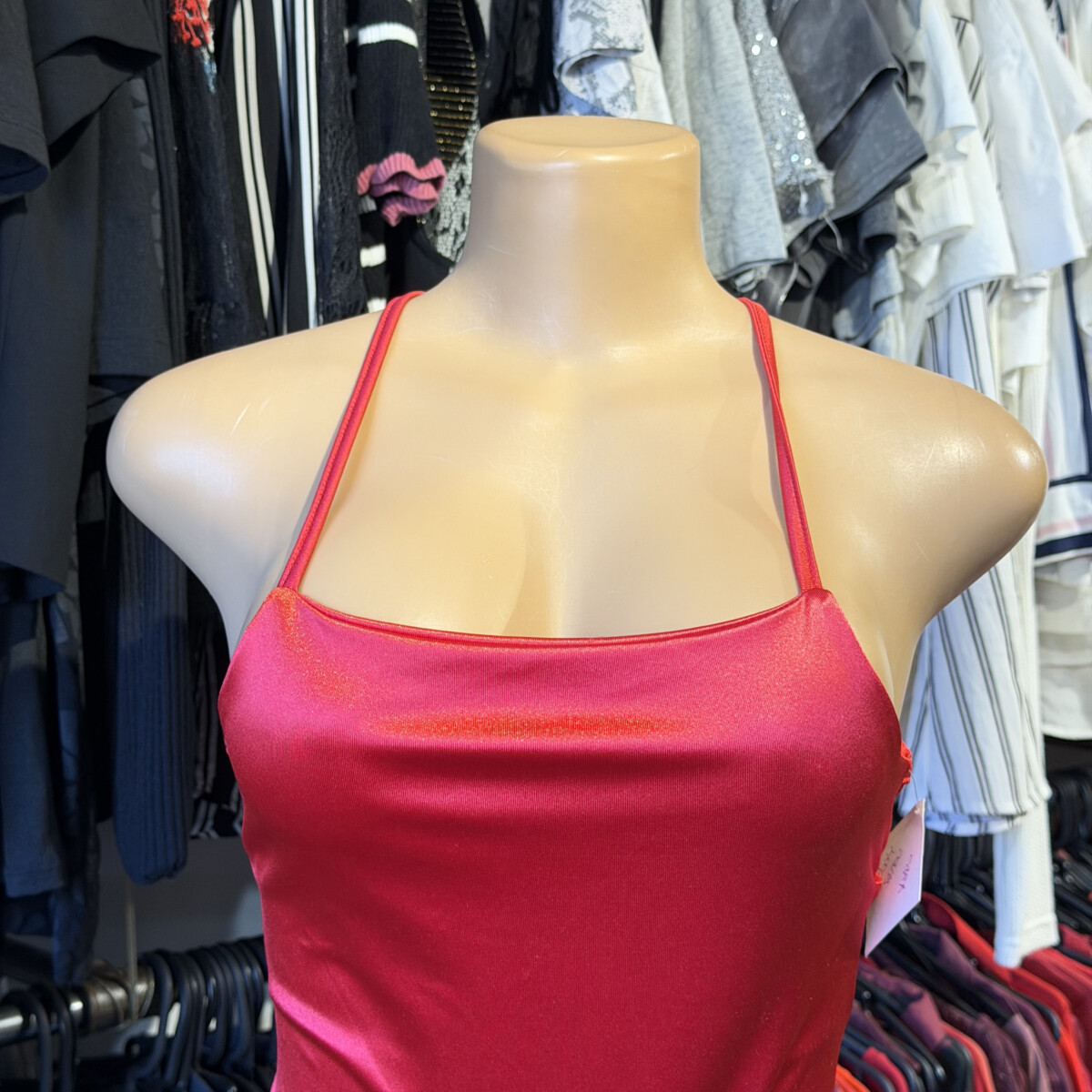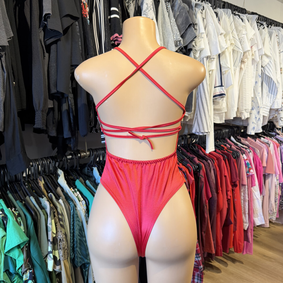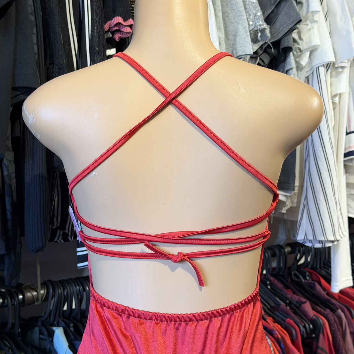 • Color rojo, satén, tiras cruzadas ajustables atrás