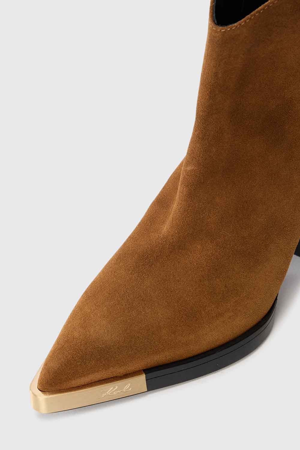 Botín de mujer de Karl Lagerfeld, con plantilla suave y suela antideslizante. El detalle dorado y la firma de Karl en la puntera le dan un toque de lujo, ideal para complementar cualquier atuendo.