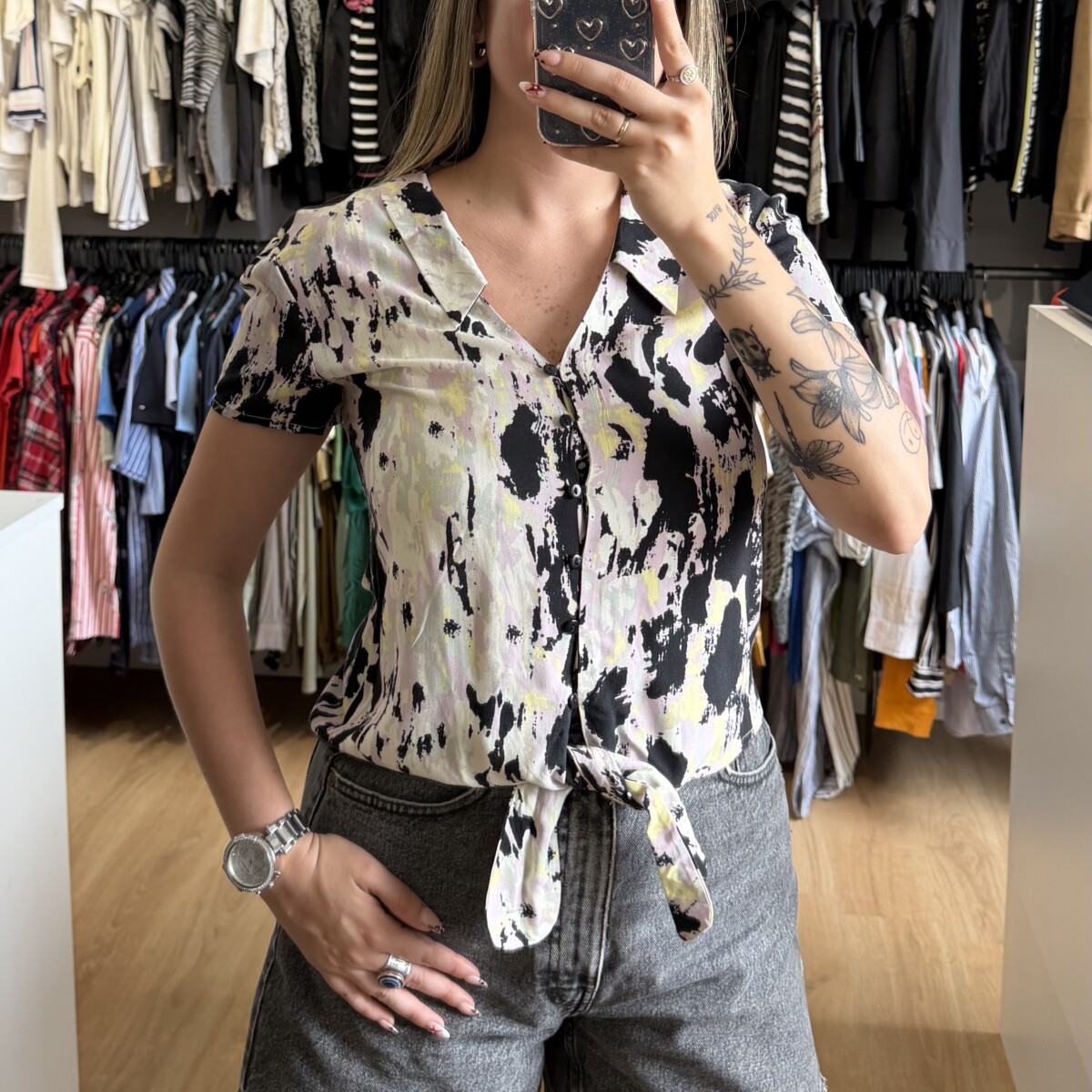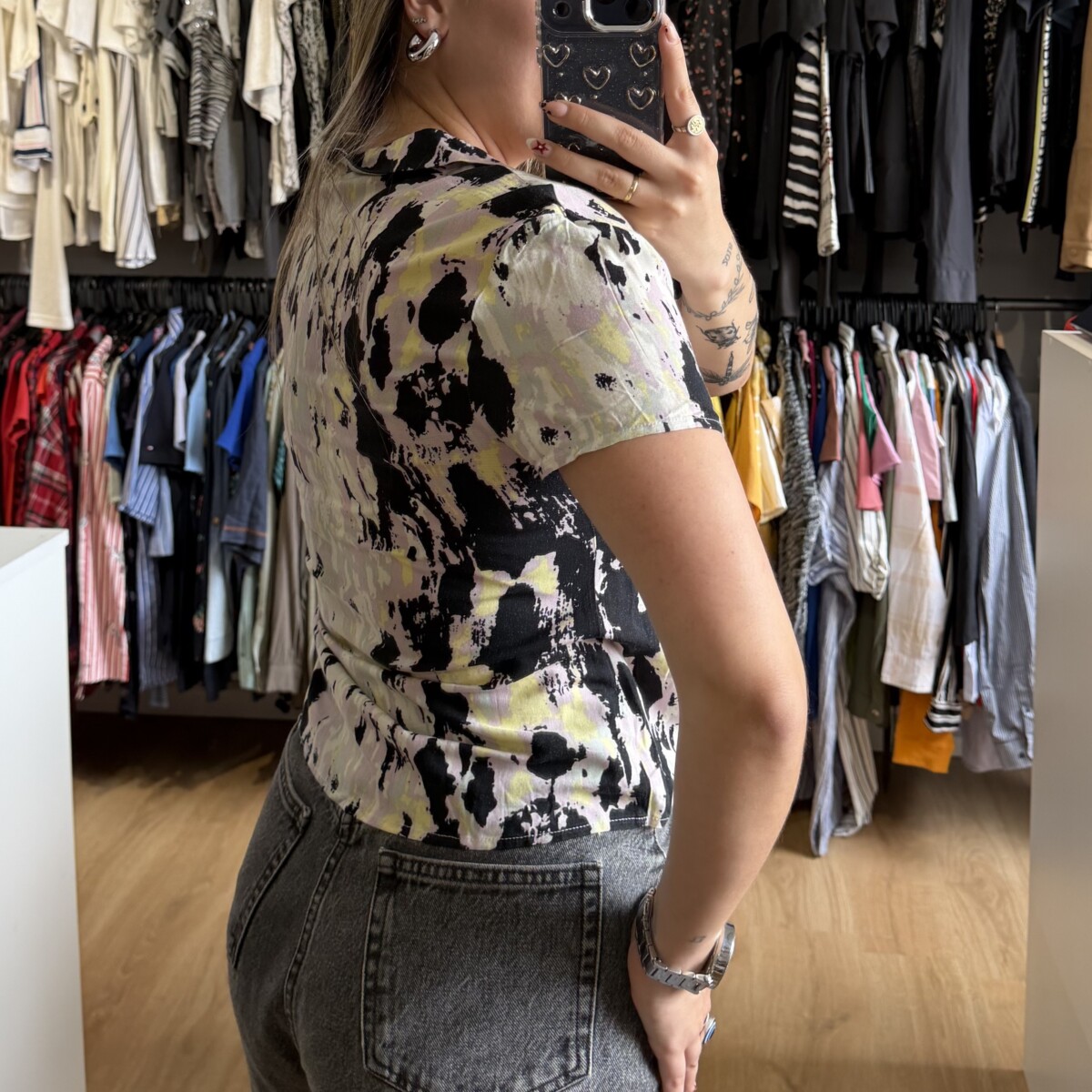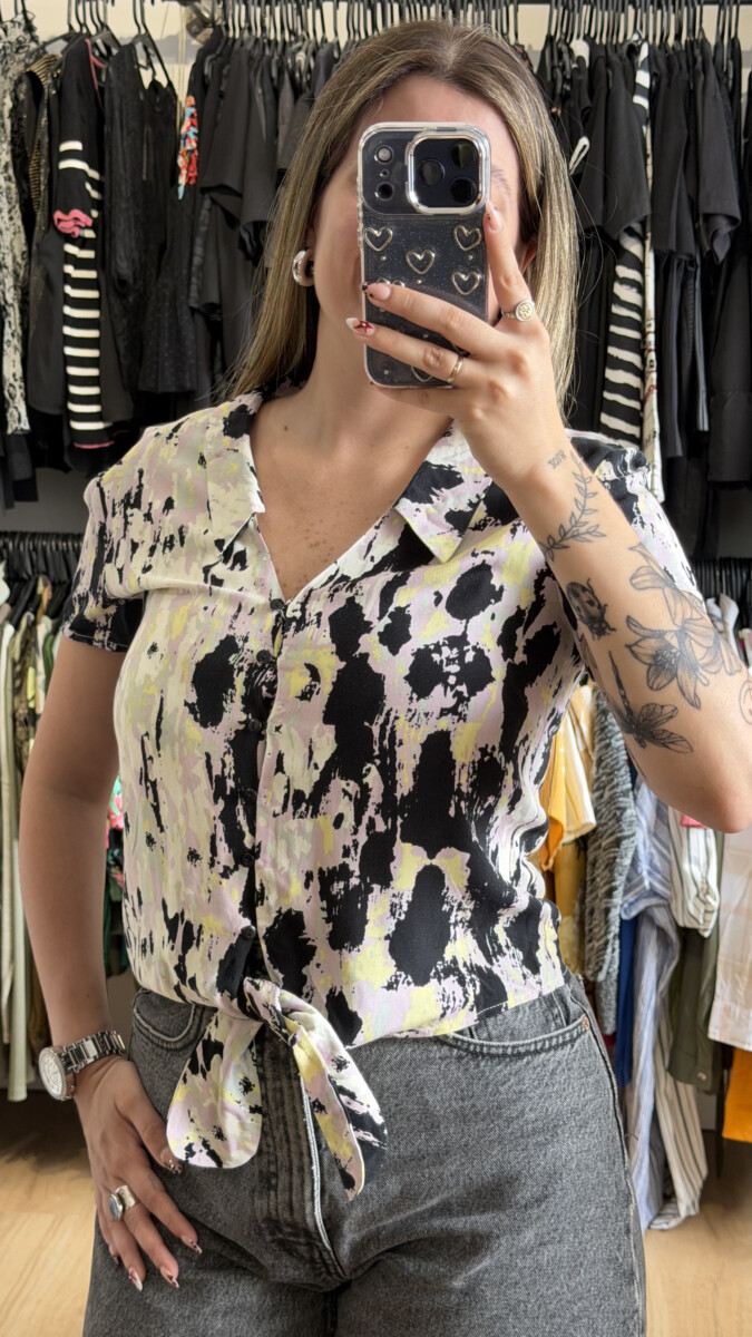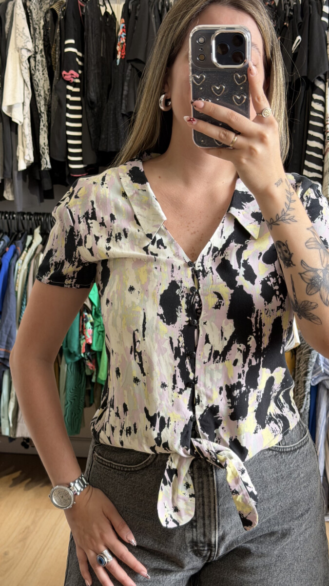 • Color blanca con estampado negro, lila, amarillo y verde claro