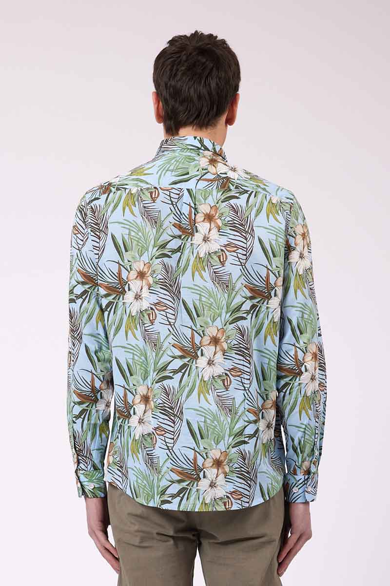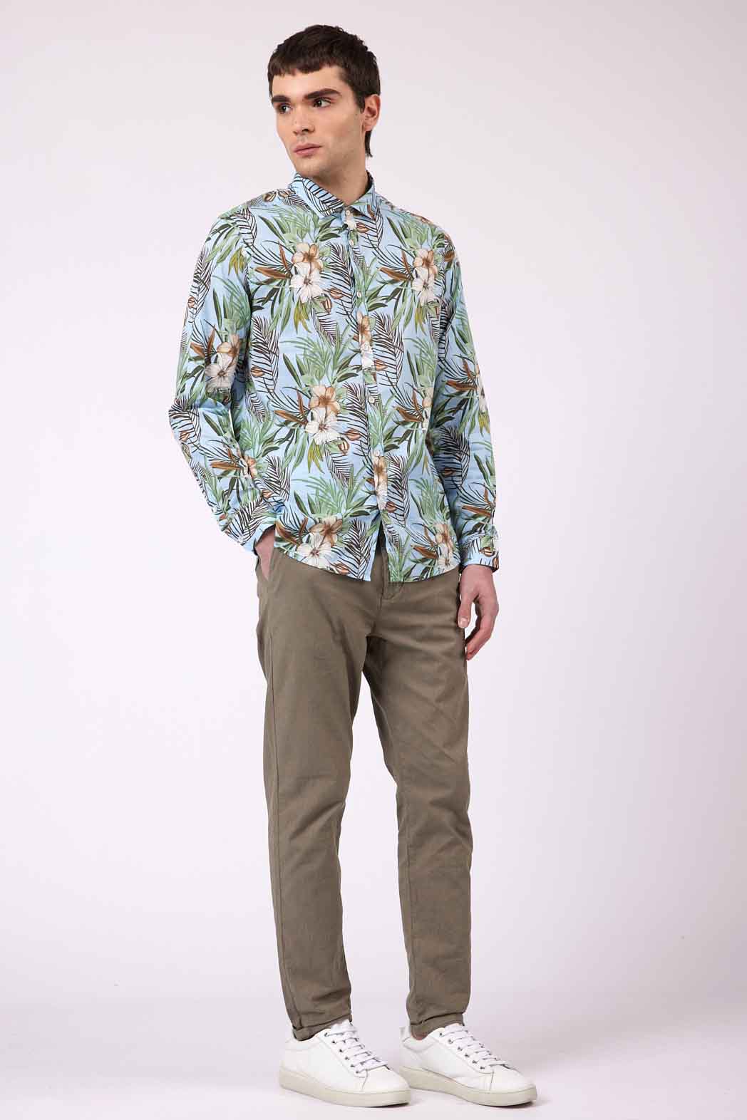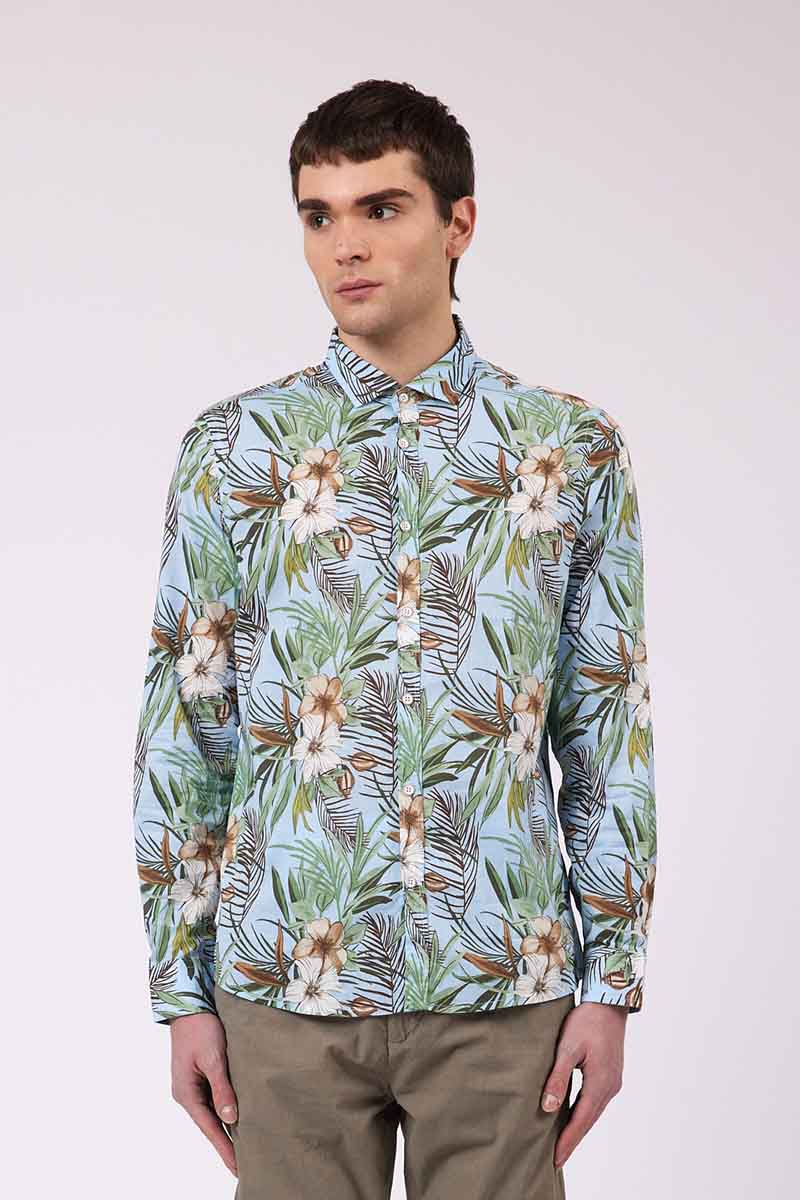 Camisa regular fit con cuello francés. Confeccionado en tejido elástico estampado. Textura con motivos florales.