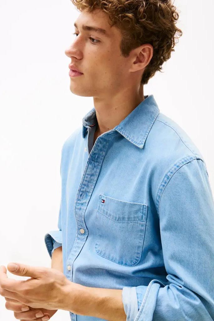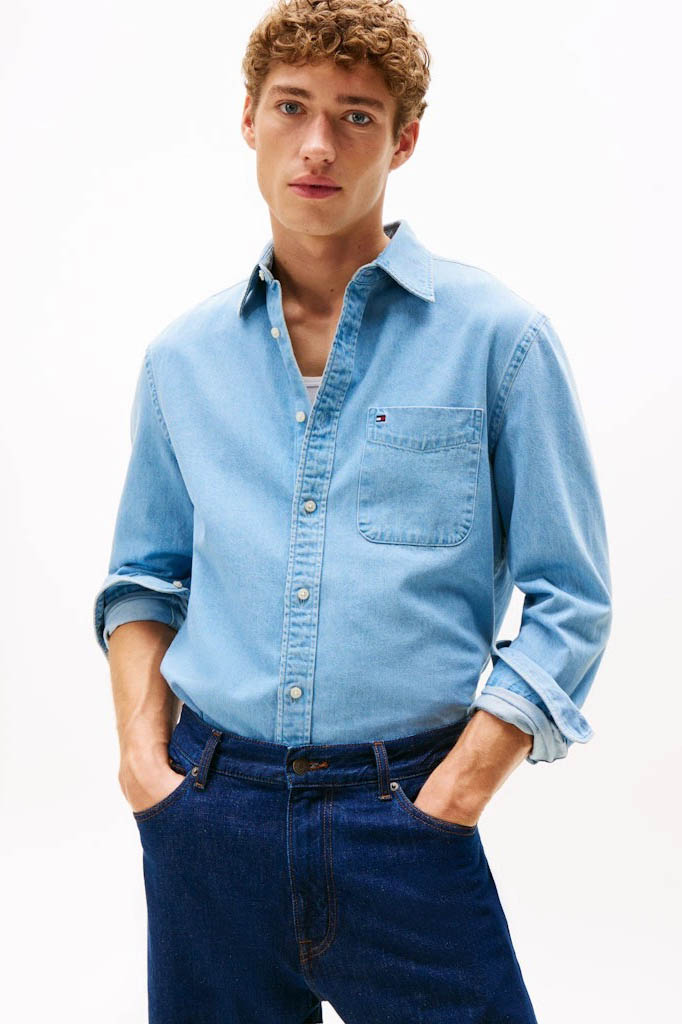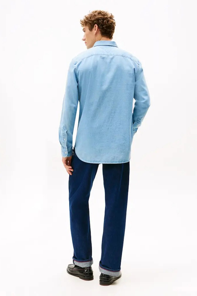 Camisa de caballero de manga larga vaquera lisa. Fit regular. Cuello sin botones.