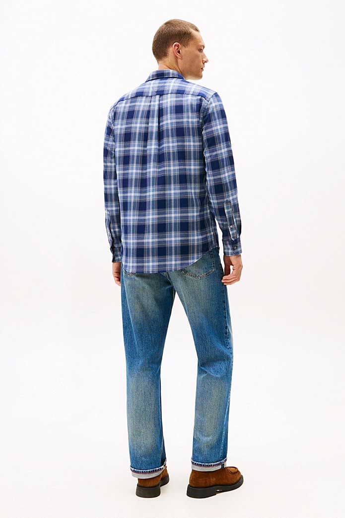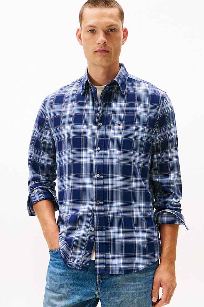 Esta camisa de sarga ligeramente elástica, perfecta para llevar encima o debajo de otras prendas, luce un estampado integral de cuadros.