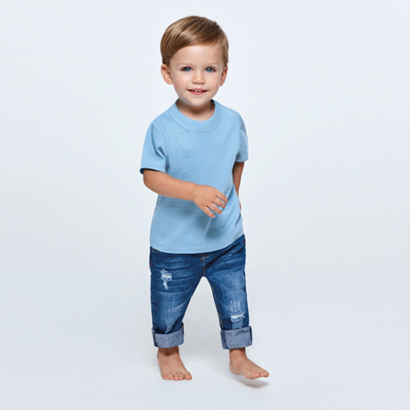 Modelo de camisetas para bebés fabricadas en algodón con 12 tonos diferentes, si estás buscando camisetas para guarderías este modelo básico de camiseta de algodón se puede personalizar con el logotipo o marca del centro.