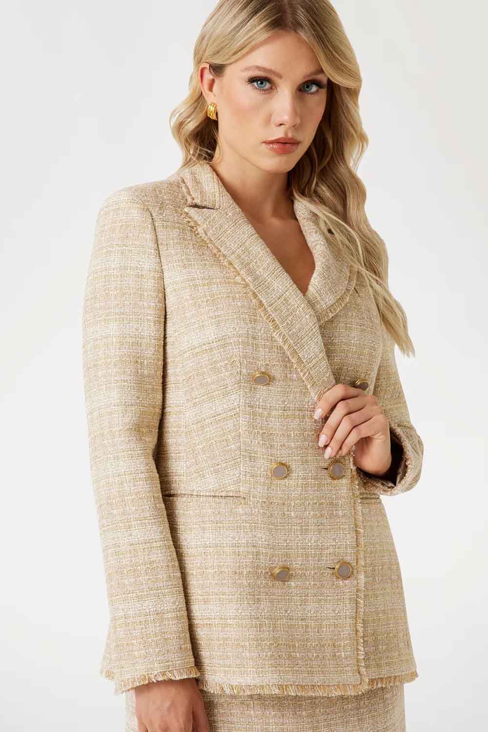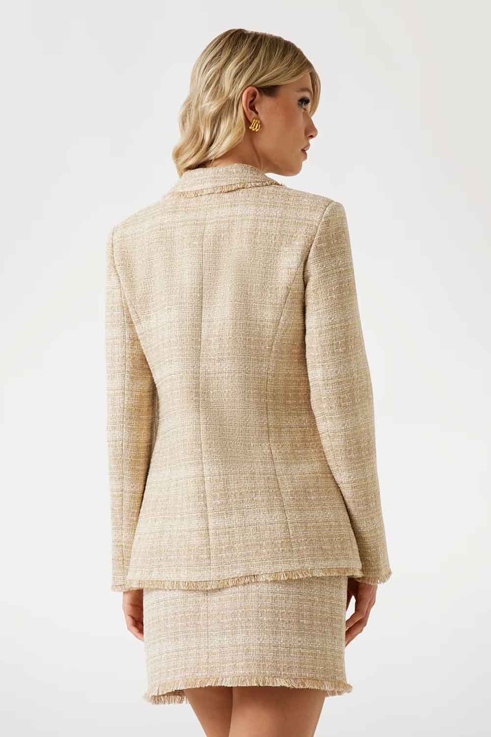 Descubre la elegancia con esta chaqueta de tweed con mezcla de algodón. Los adornos metalizados y el acabado deshilachado transmiten sofisticación. Con cierre doble, es ideal para una noche elegante o un día en la oficina. Bolsillos laterales para un toque práctico.
