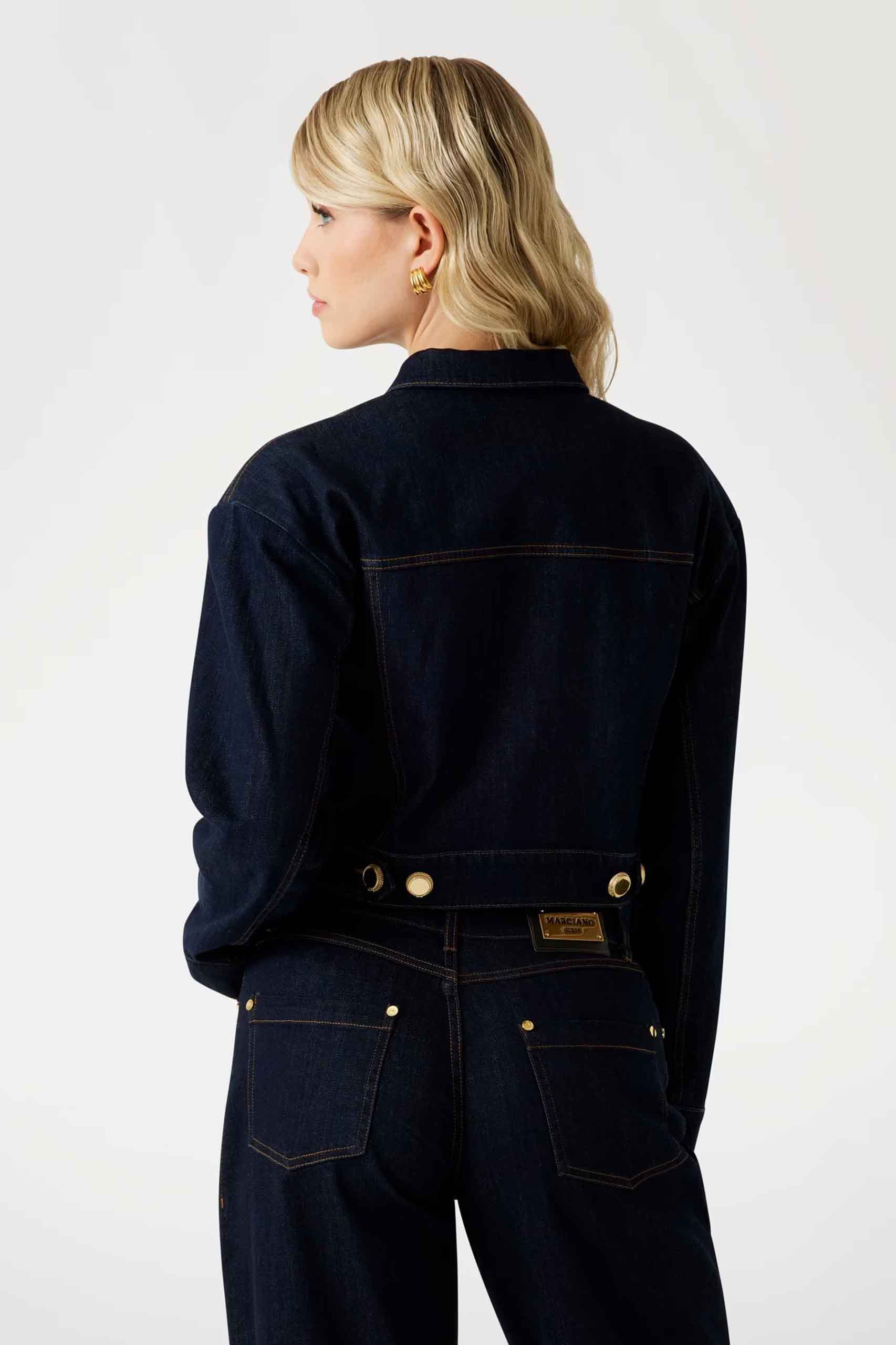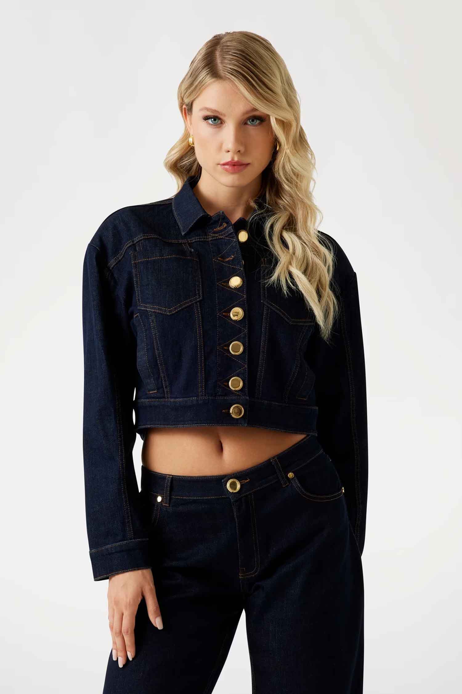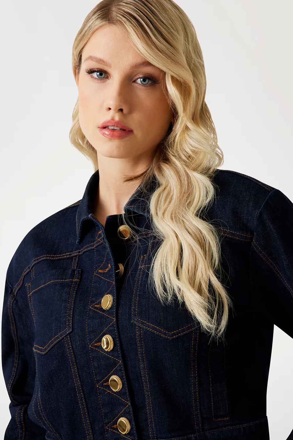 Luce espectacular con esta chaqueta corta de denim elástico. Su lavado oscuro y cuello clásico aportan un toque sofisticado. Los bolsillos de parche y los laterales añaden funcionalidad. Con cierre de botones, es ideal para un brunch o un día casual en la ciudad.