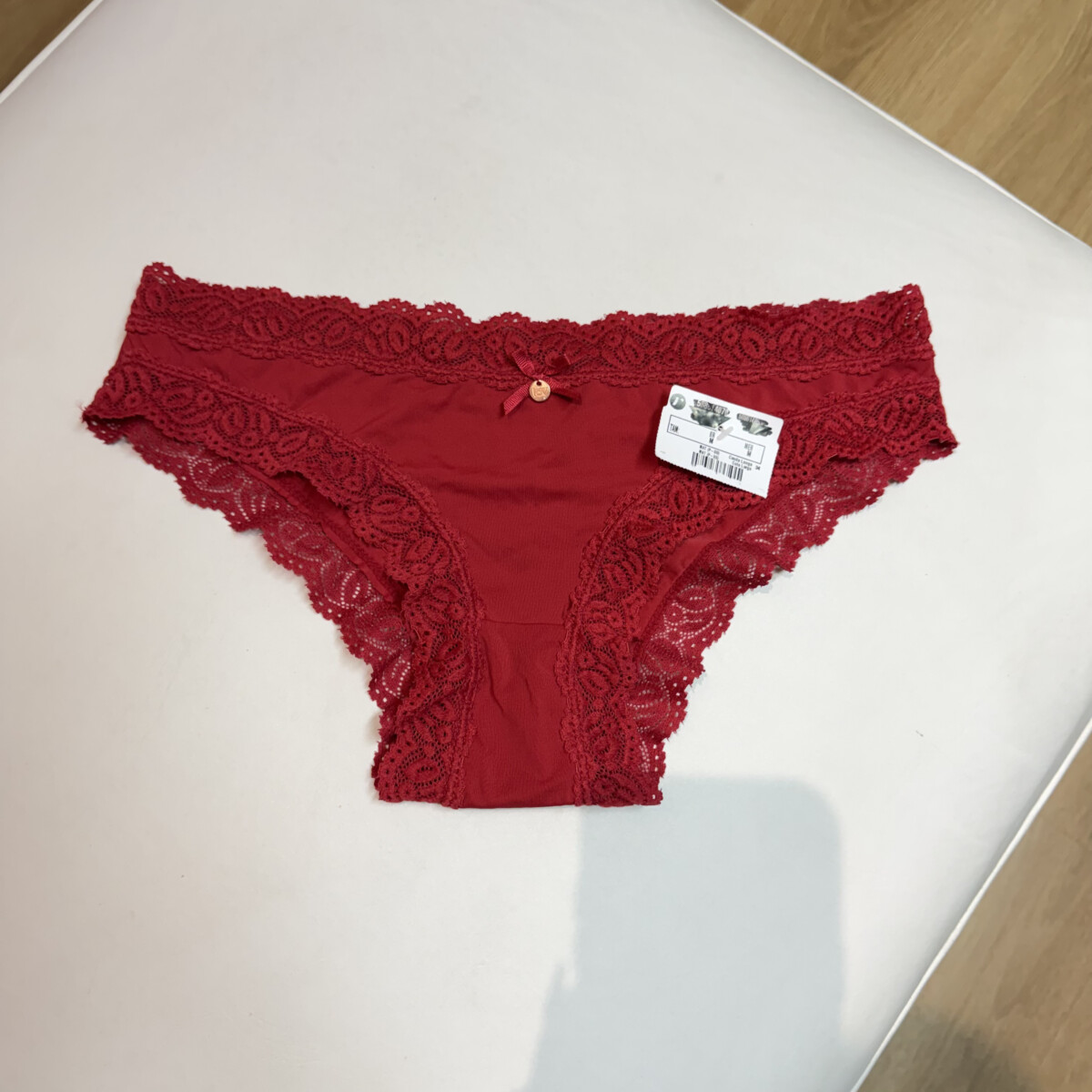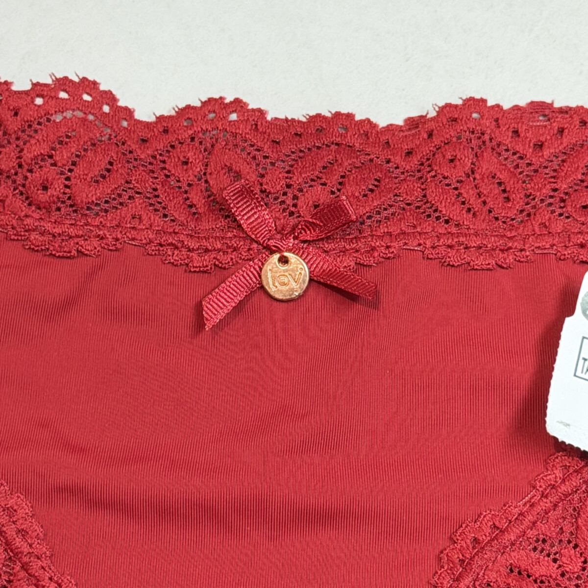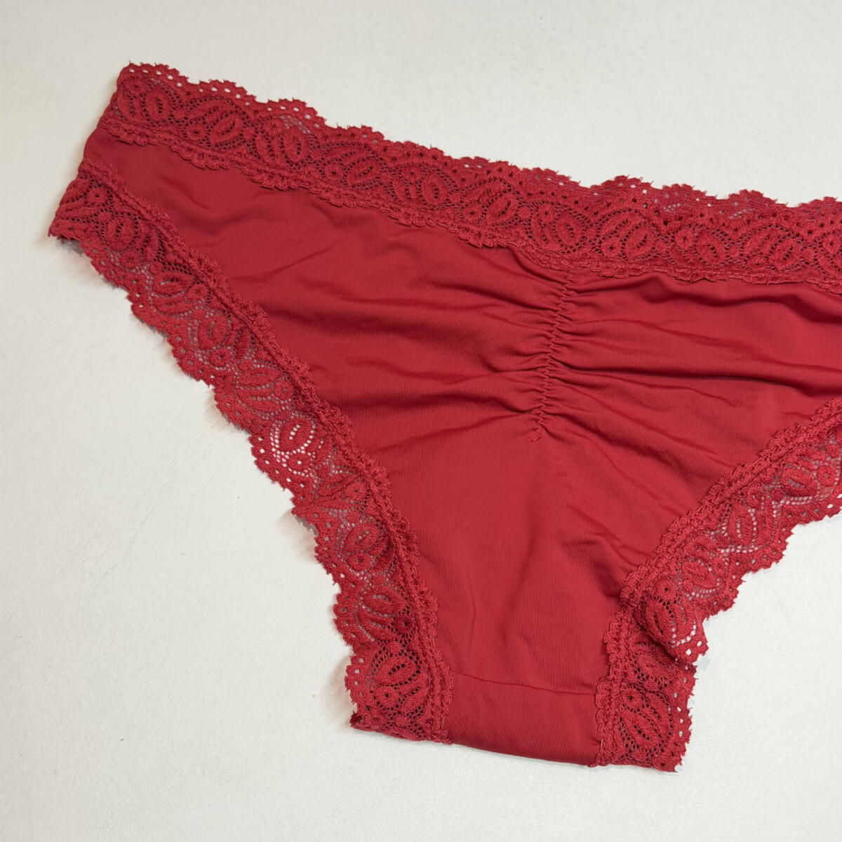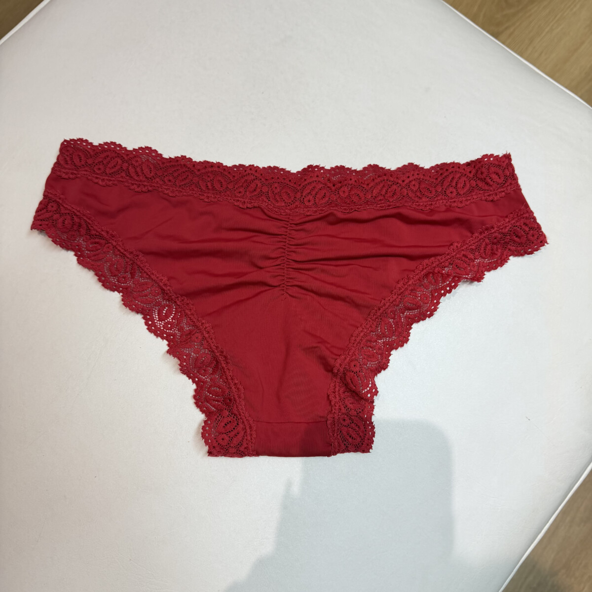 • Color bordo, reborde encaje, frunce atrás