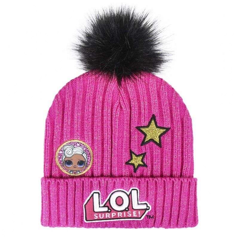 Precioso gorro de LOL Surprise con un moderno diseño en clor rosa con pompon negro y diferentes motivos bordados entre ellos la cara de la muñeca LOL Surprise DJ .