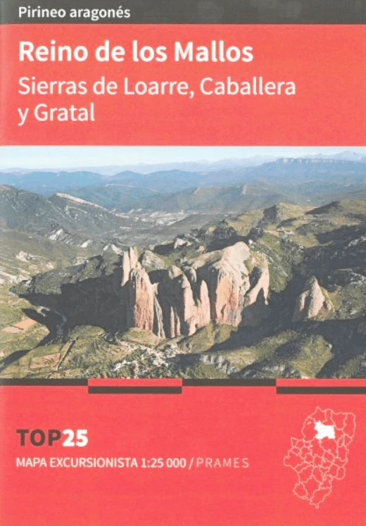 Este mapa muestra las numerosas posibilidades de excursiones y ascensiones por el Reino de los Mallos: sierras de Loarre, Caballera y Gratal.
