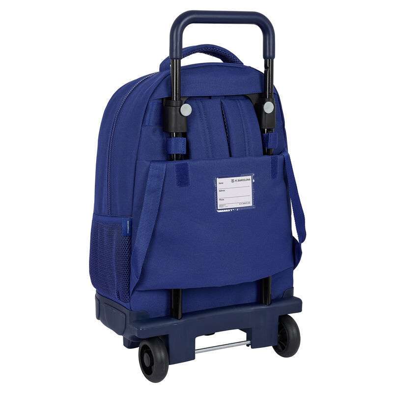 Te encantará esta Mochila con carro compact desmontable del FC Barcelona con diseño en color azul y frontal a rayas azul y grana y dibujo del escudo a todo color.