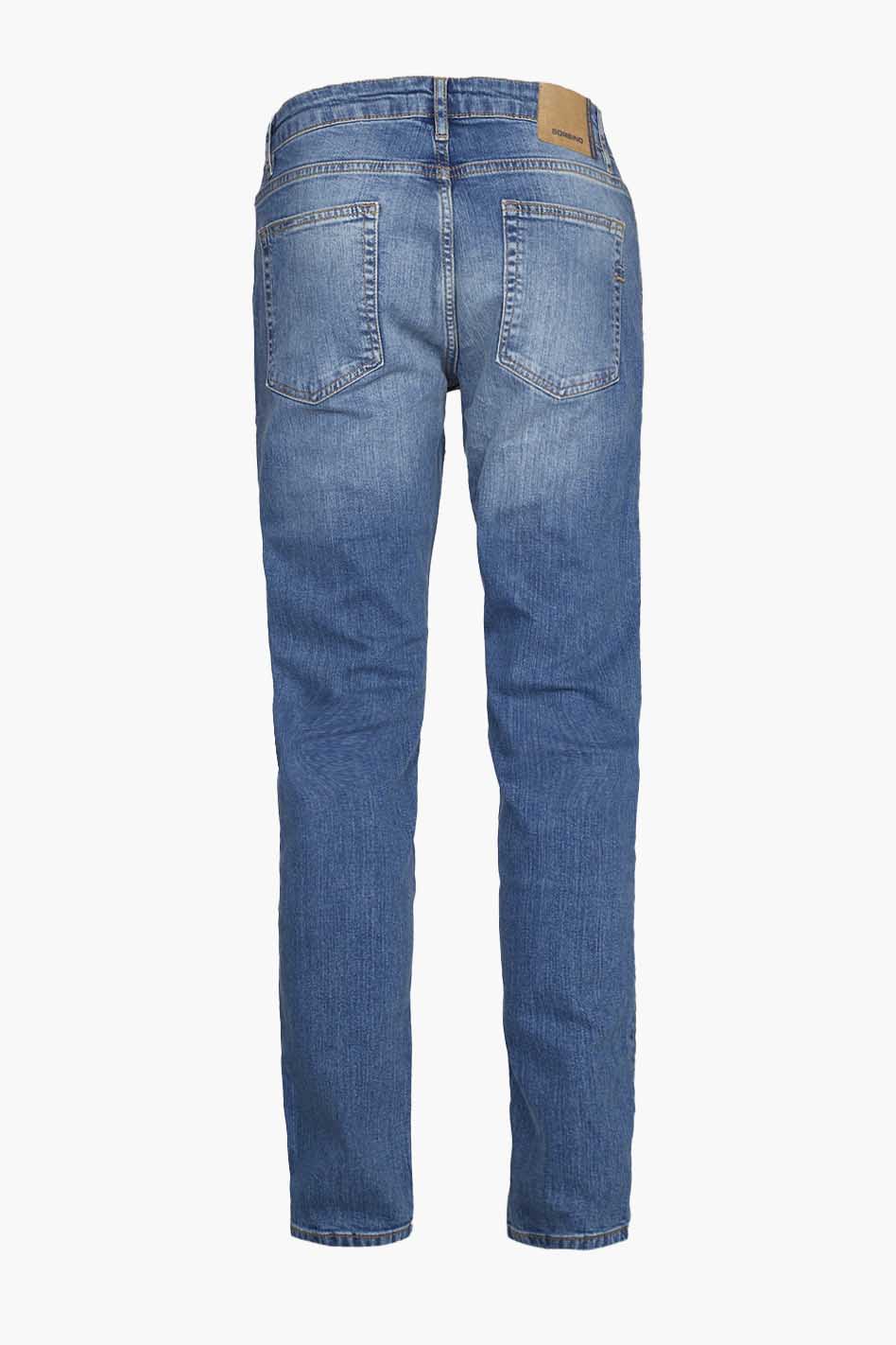Jeans slim fit cinco bolsillos con lavado azul medio-claro. Cierre frontal con botones.