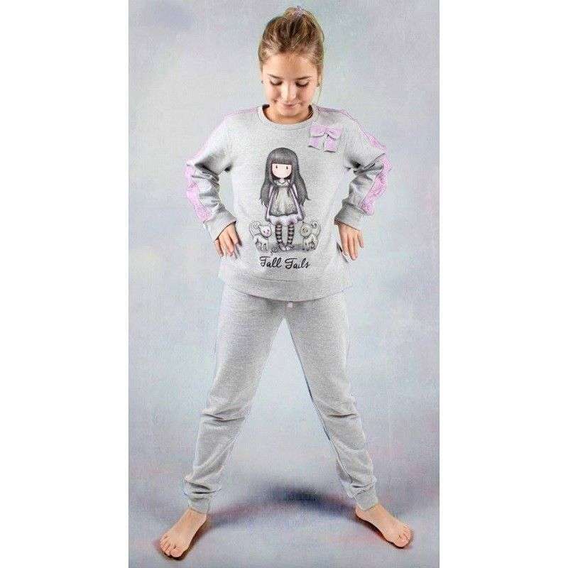 Te encantará este bonito Pijama de invierno Gorjuss Tall Tails para niña en tejido de felpa vigoré en color gris con un lazo y gran dibujo de la muñeca Gorjuss Tall Tails y detalle de puntilla lencera.