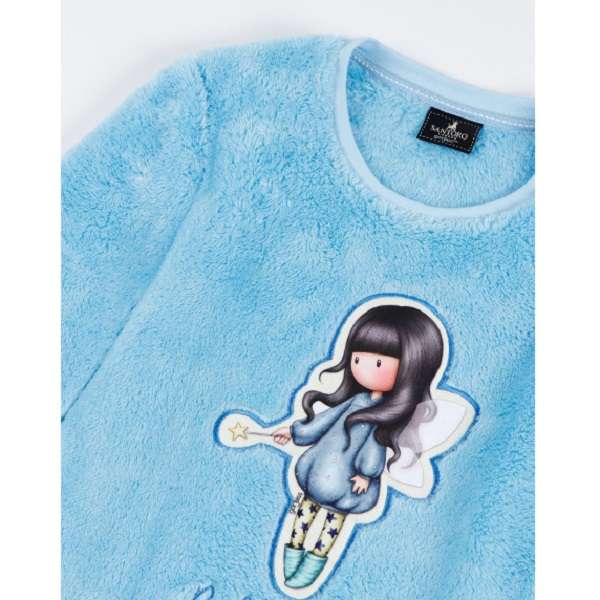 Te encantará este bonito Pijama Gorjuss de coralina para niña con diseño en color azul con bonito dibujo de la muñeca Gorjuss Bubble Fairy con bordados y pantalón con cinturilla ajustable.