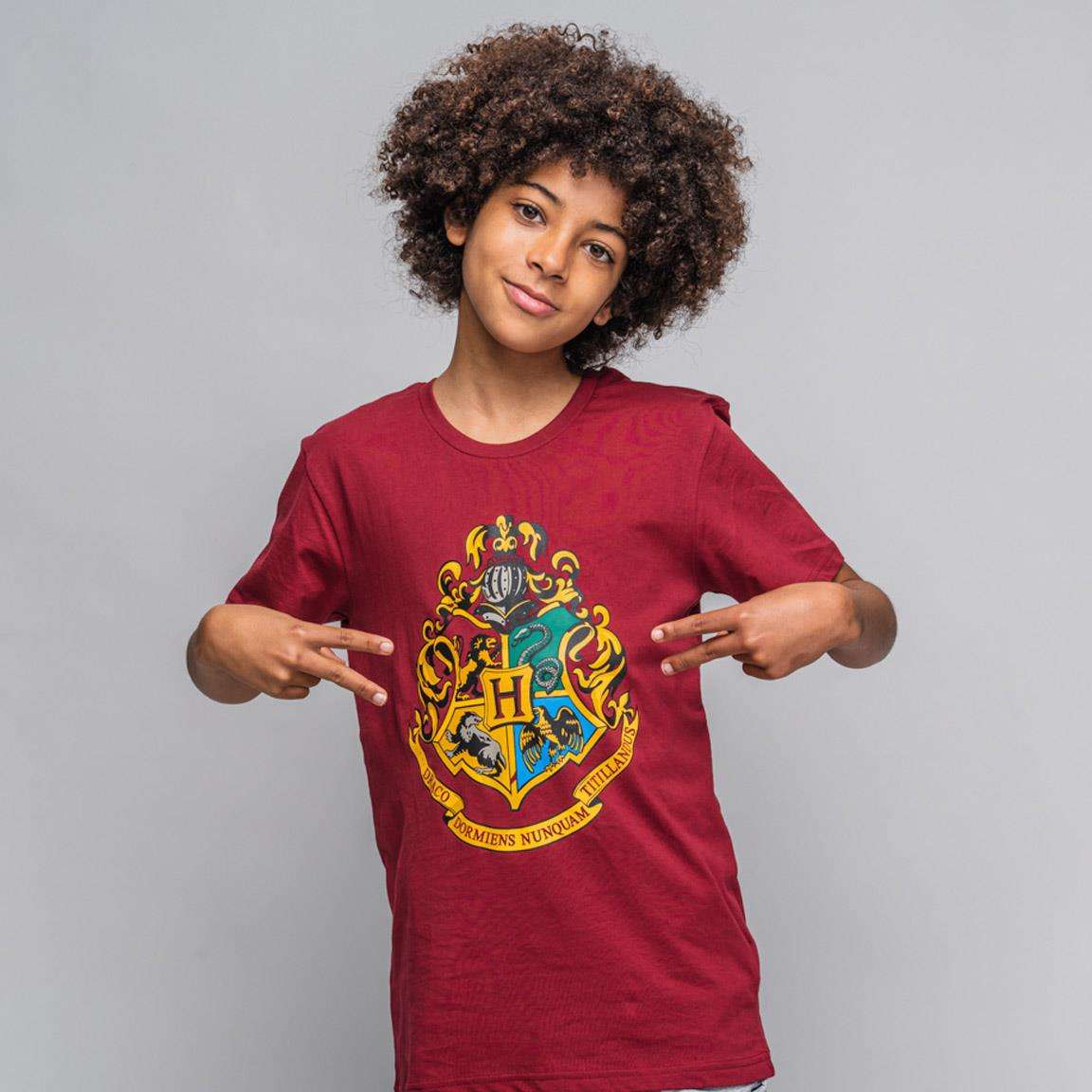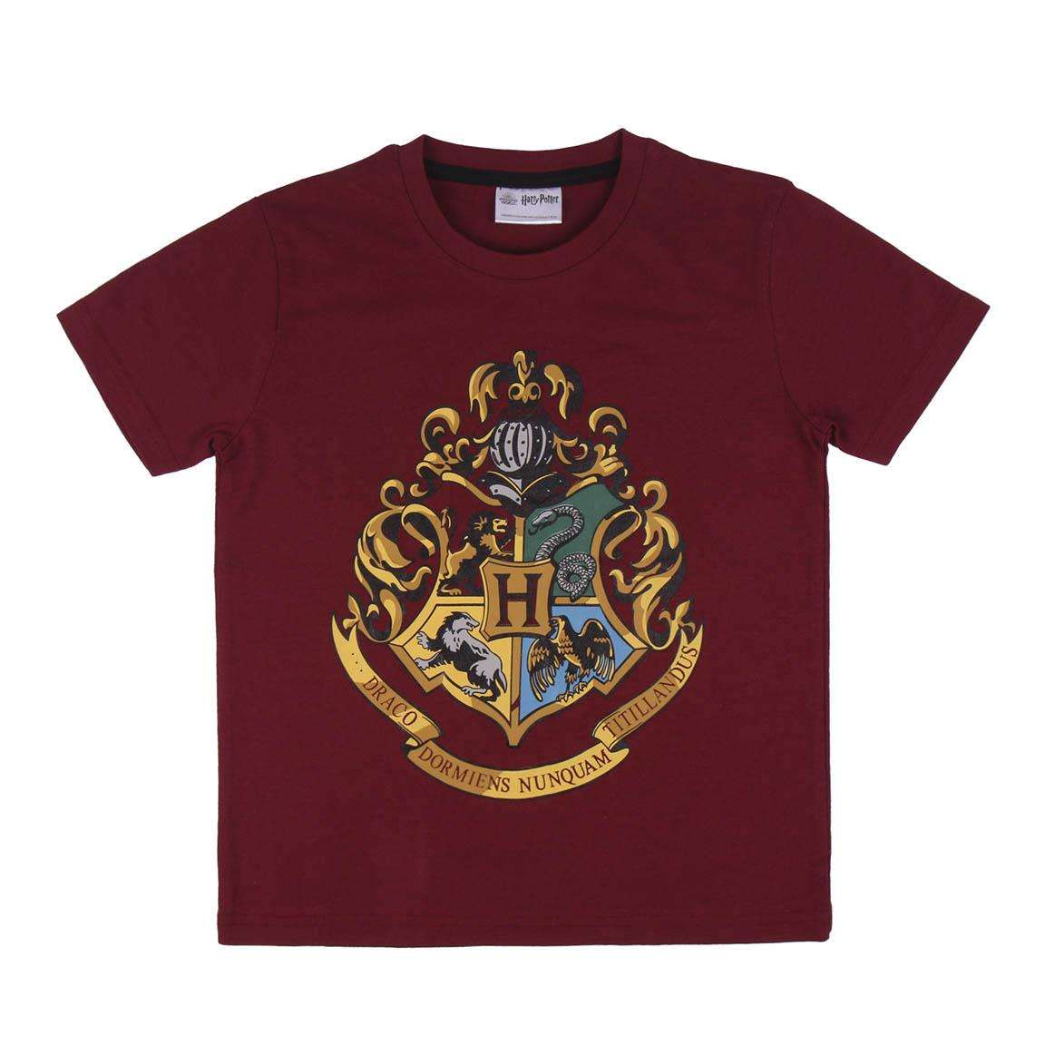 Este verano lo pasarás fresquito gracias a este bonito Pijama infantil de Harry Potter con un bonito diseño en color burdeos con camiseta con mangas cortas y estampado del escudo de  Hogwarts y pantalón con estampado.
