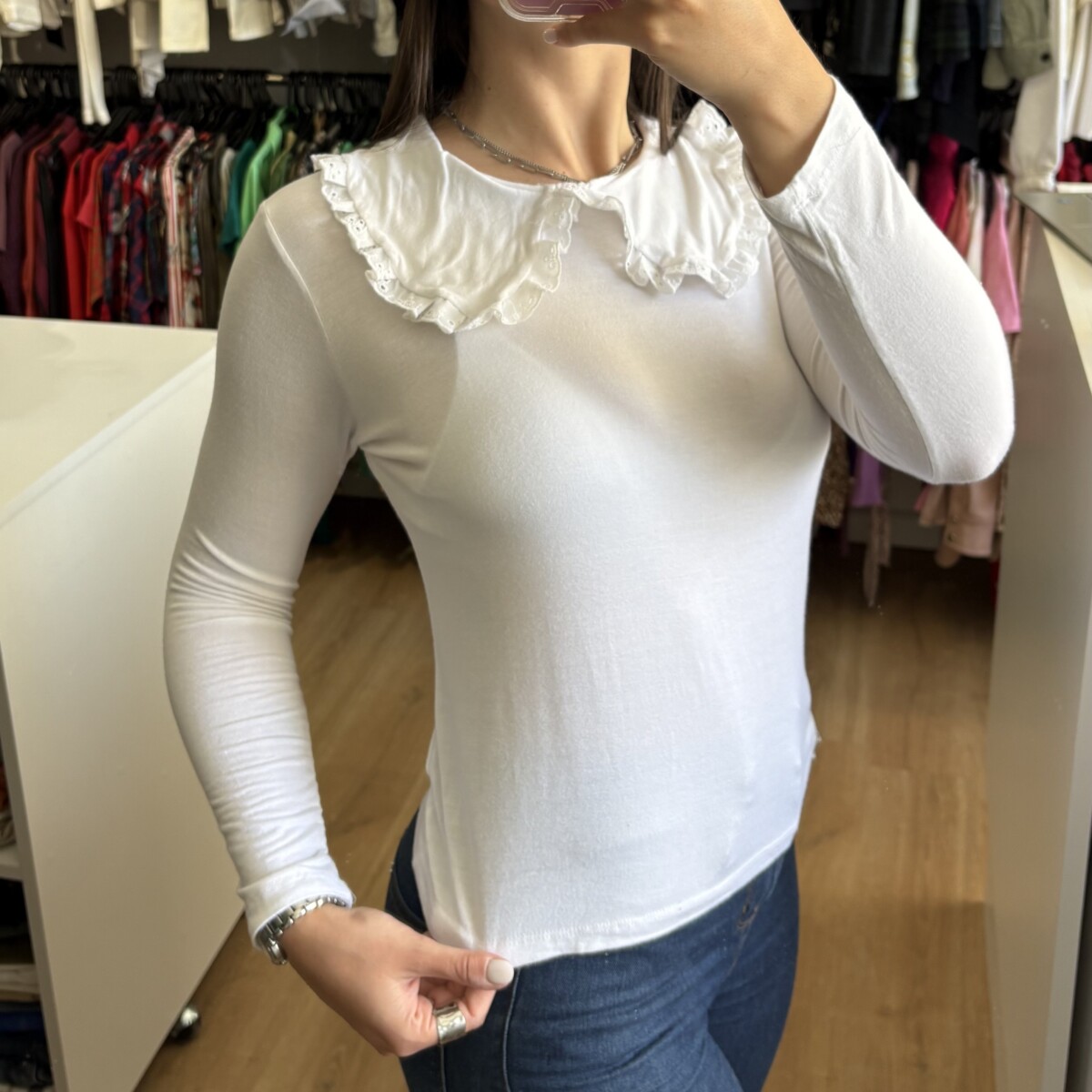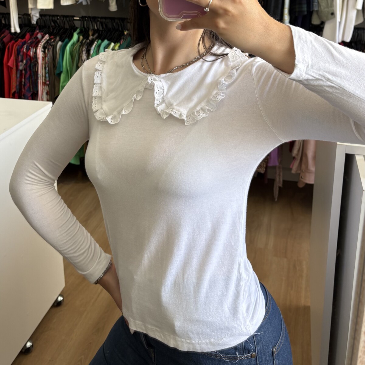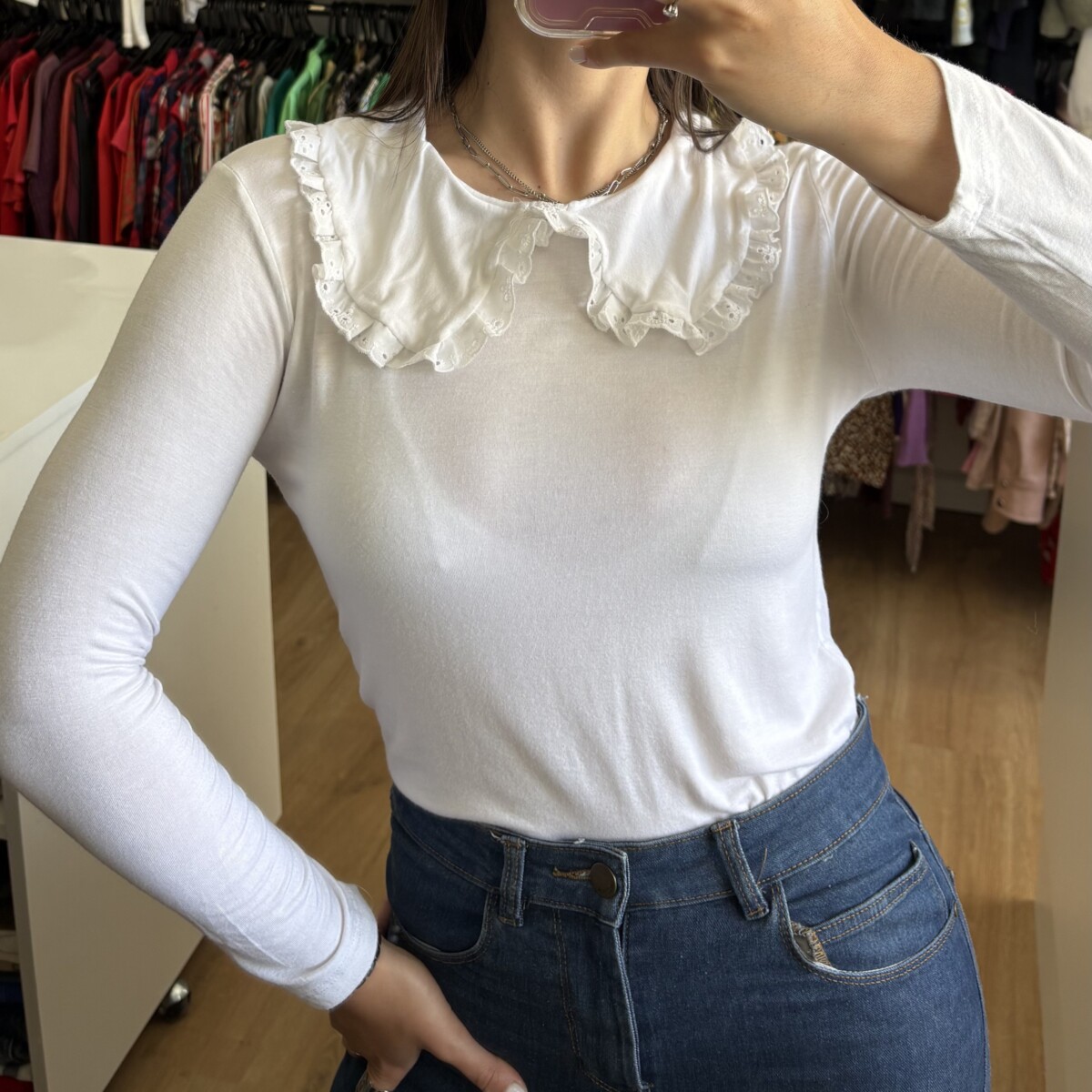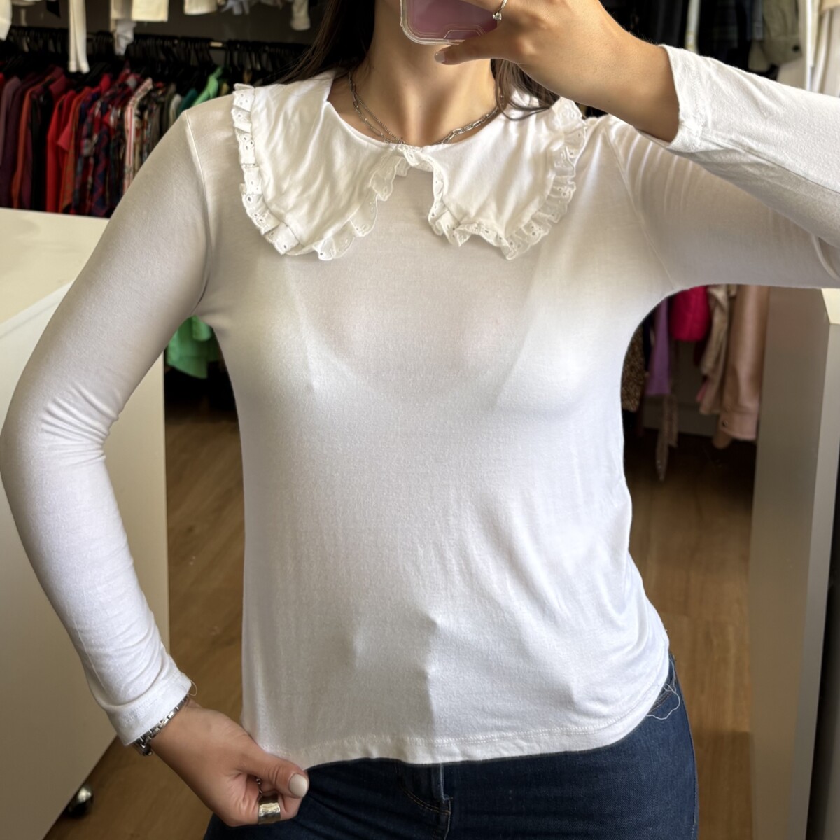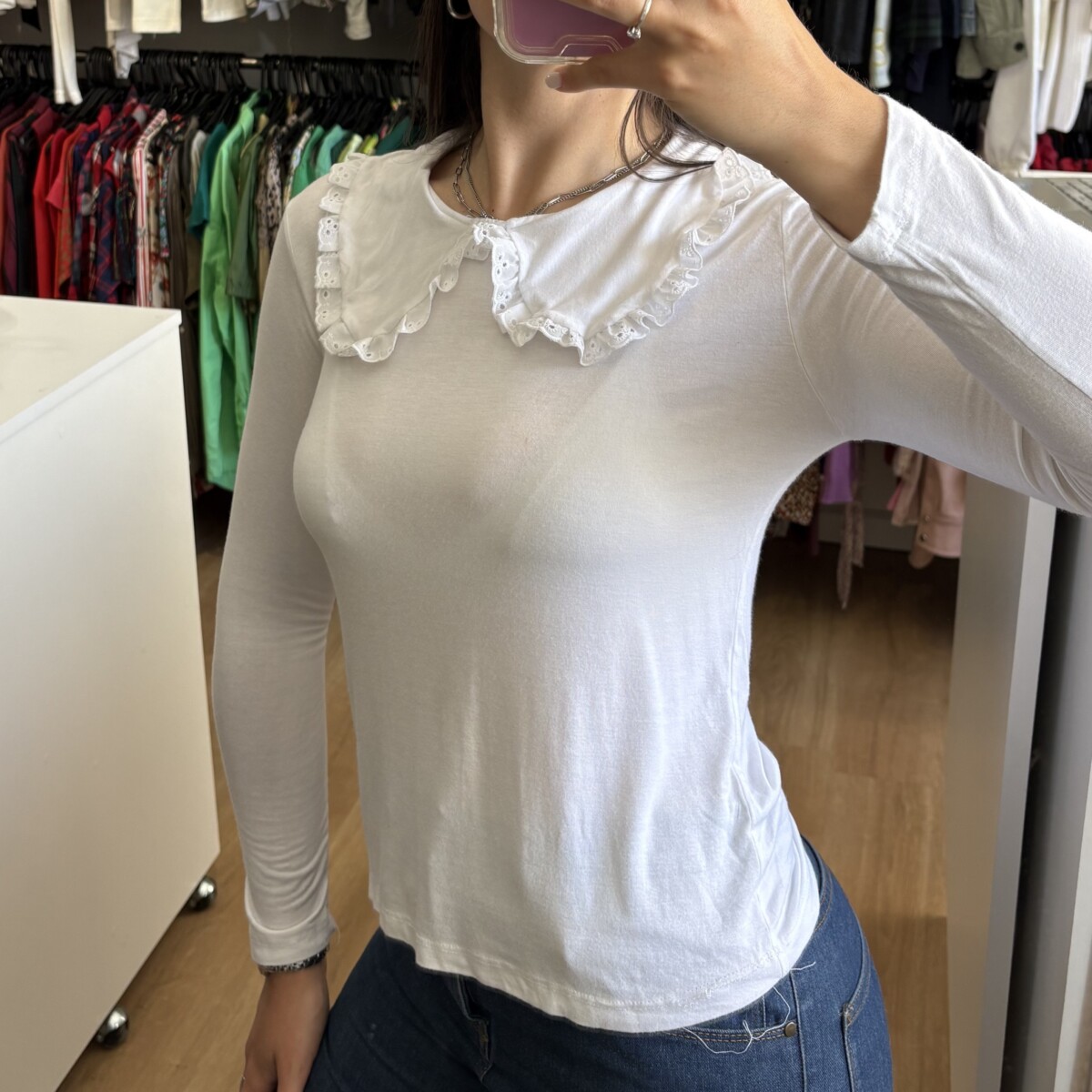 • Remera blanca con cuello bebe
