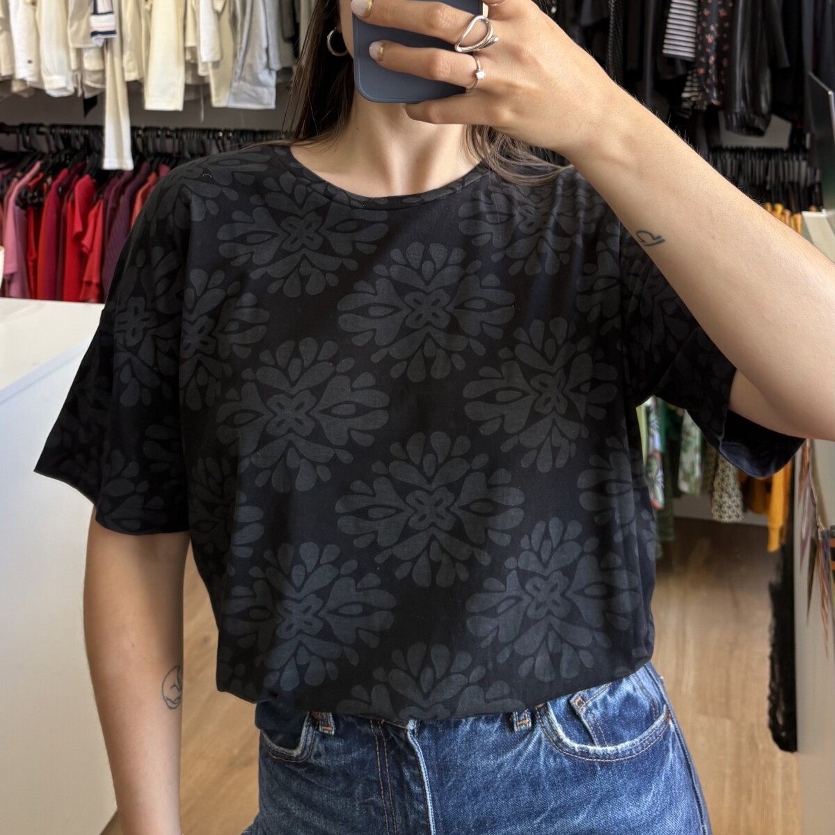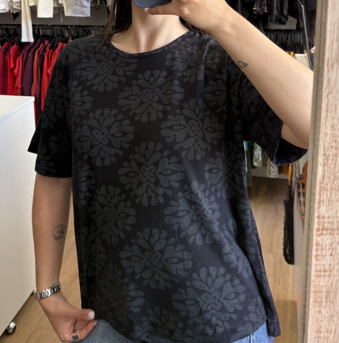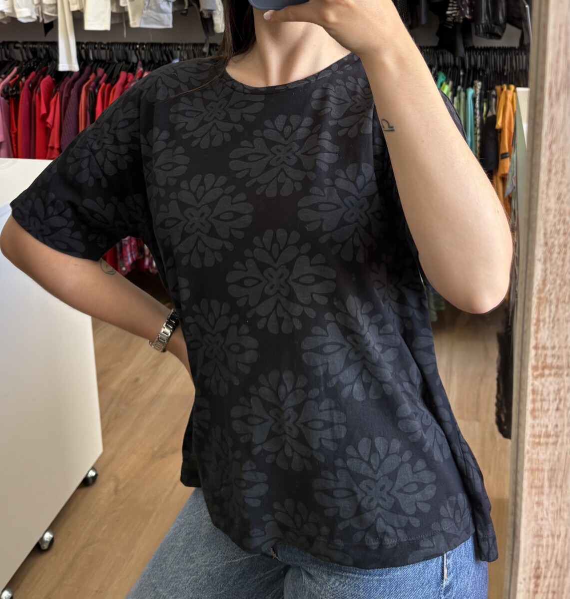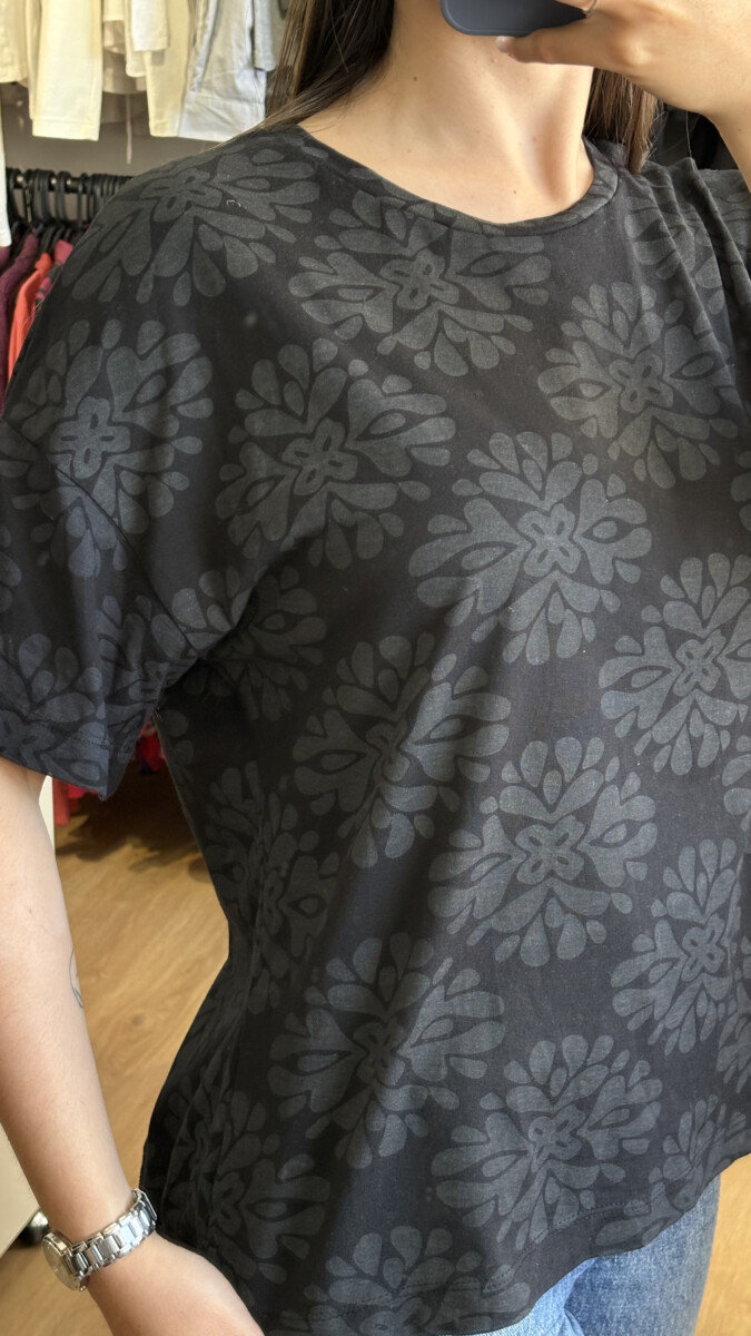 • Remera marca Indian negra con “mandalas” gris oscuro
