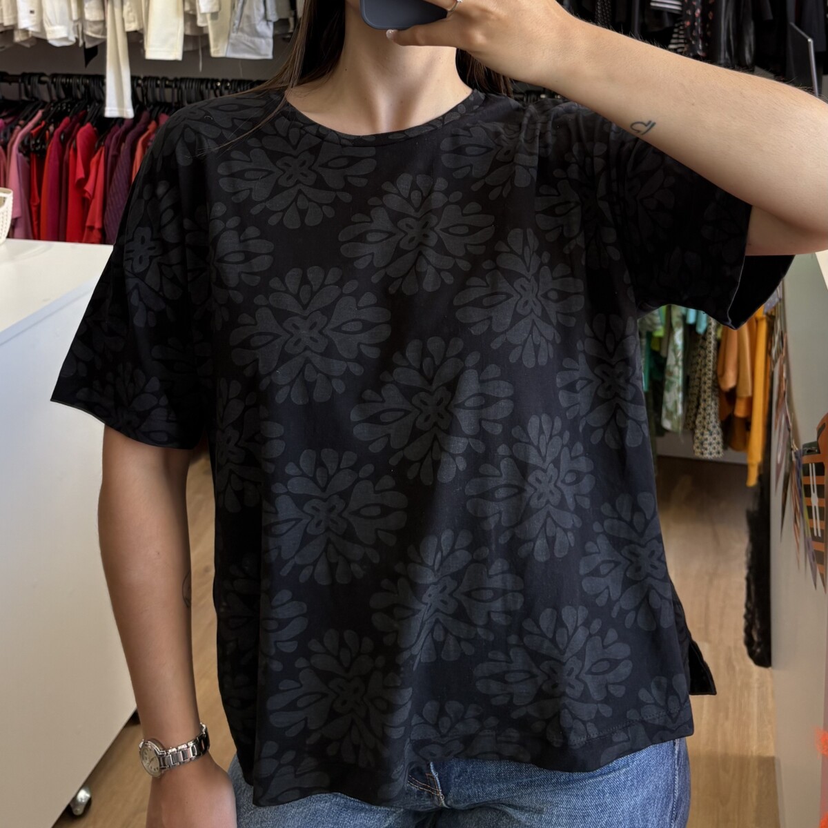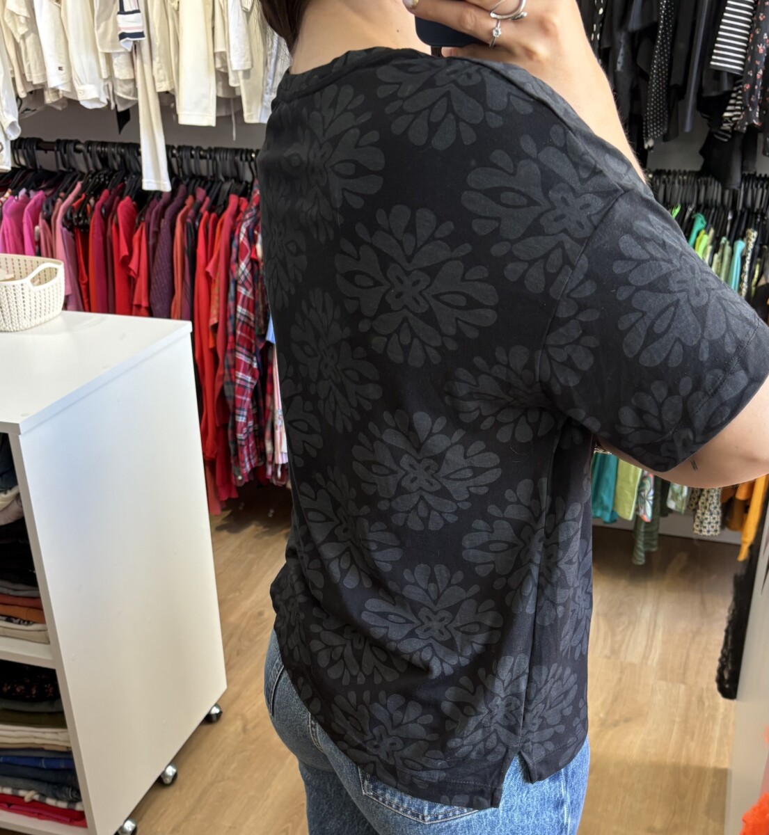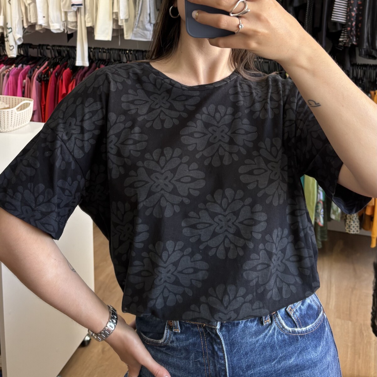 • Remera marca Indian negra con “mandalas” gris oscuro