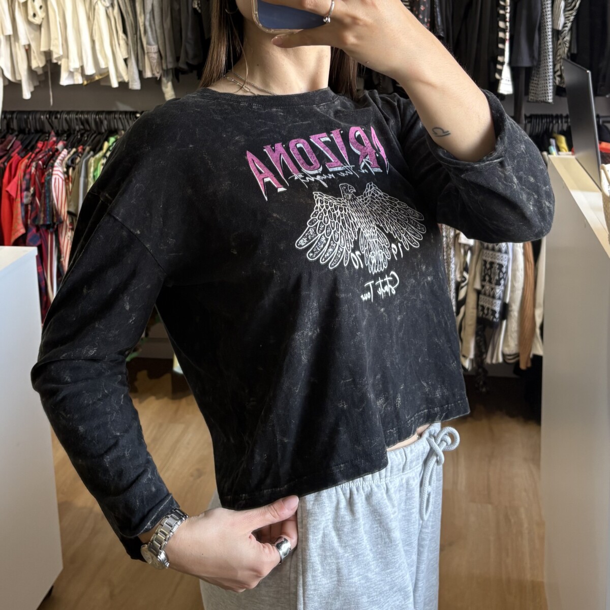 Remera N+ negra con beige, rosa y blanco