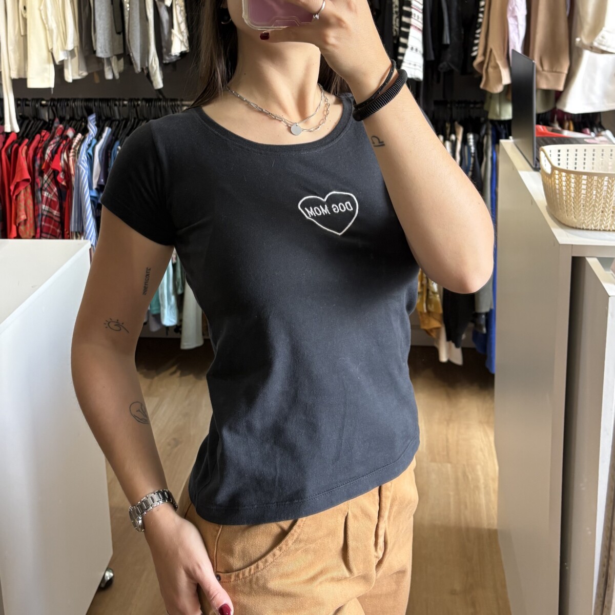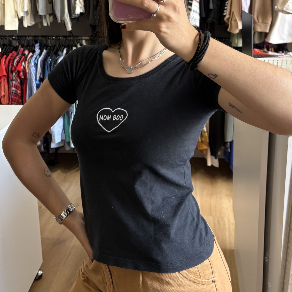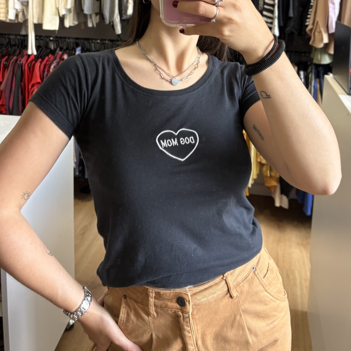 • Remera de algodón color negra con bordado blanco “DOG MOM”