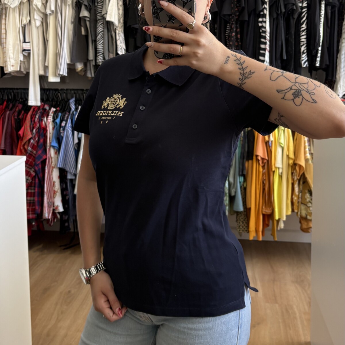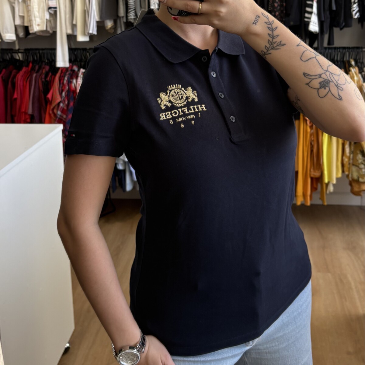 • Remera marca Tommy Hilfiger, color negra con logo bordado en beige
