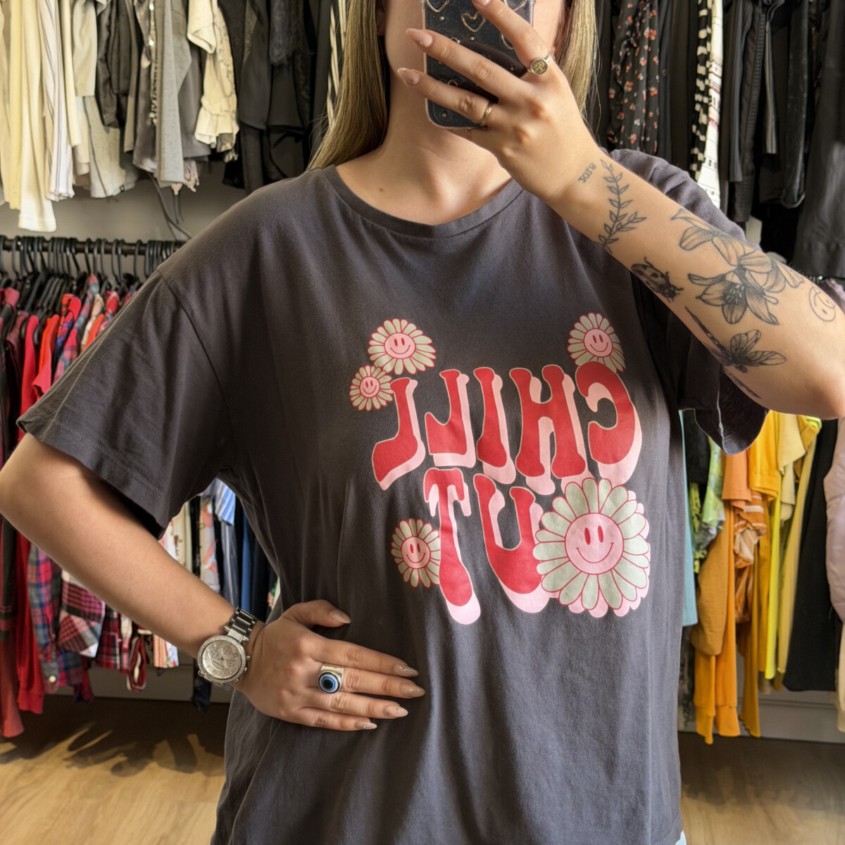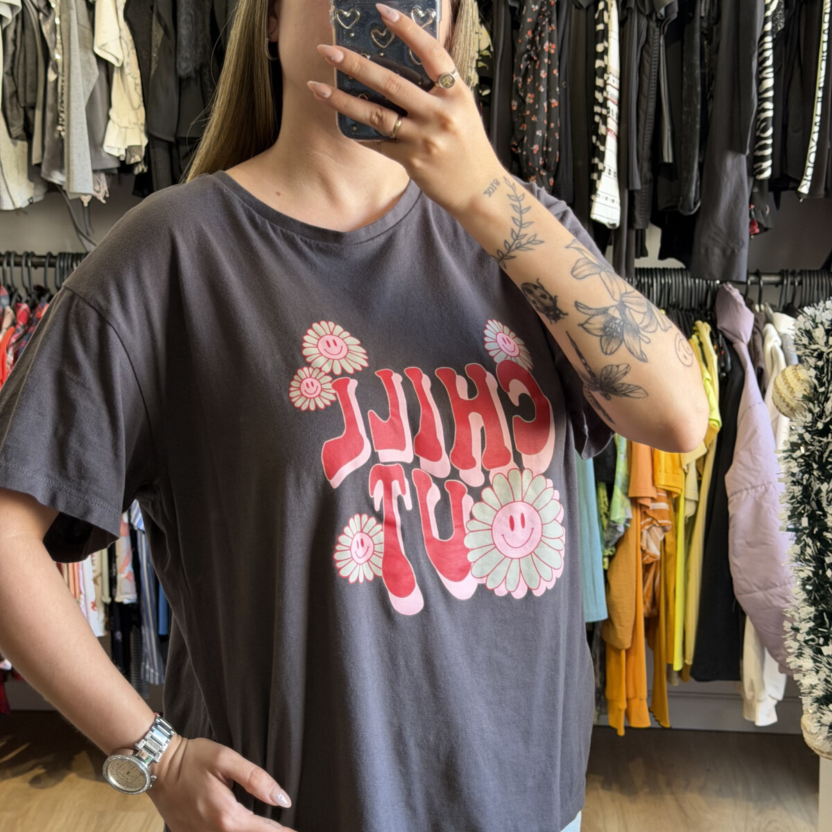 • Letras rojas “CHILL OUT” con flor, rosa y verde