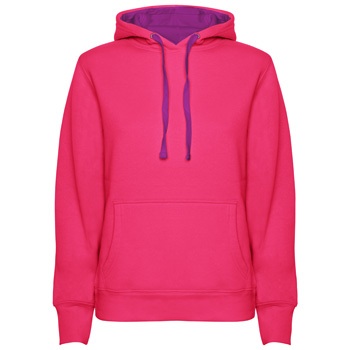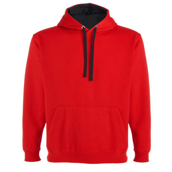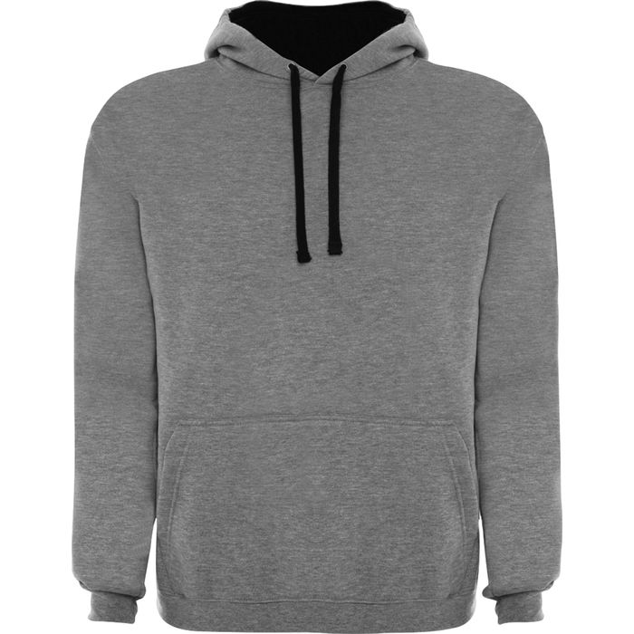 - Sudaderas bicolor urban Marca Roly: Capucha de doble tejido, con cordón contrastado ajustable, cubrecosturas en el cuello y bolsillo canguro.