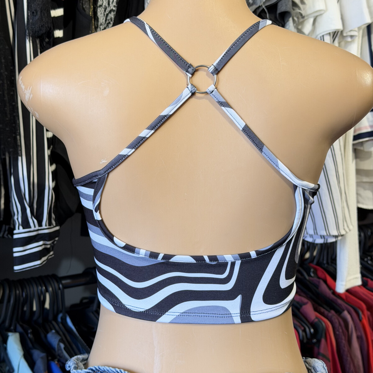 • Top estampado con líneas asimétricas de color negro, gris y blanco