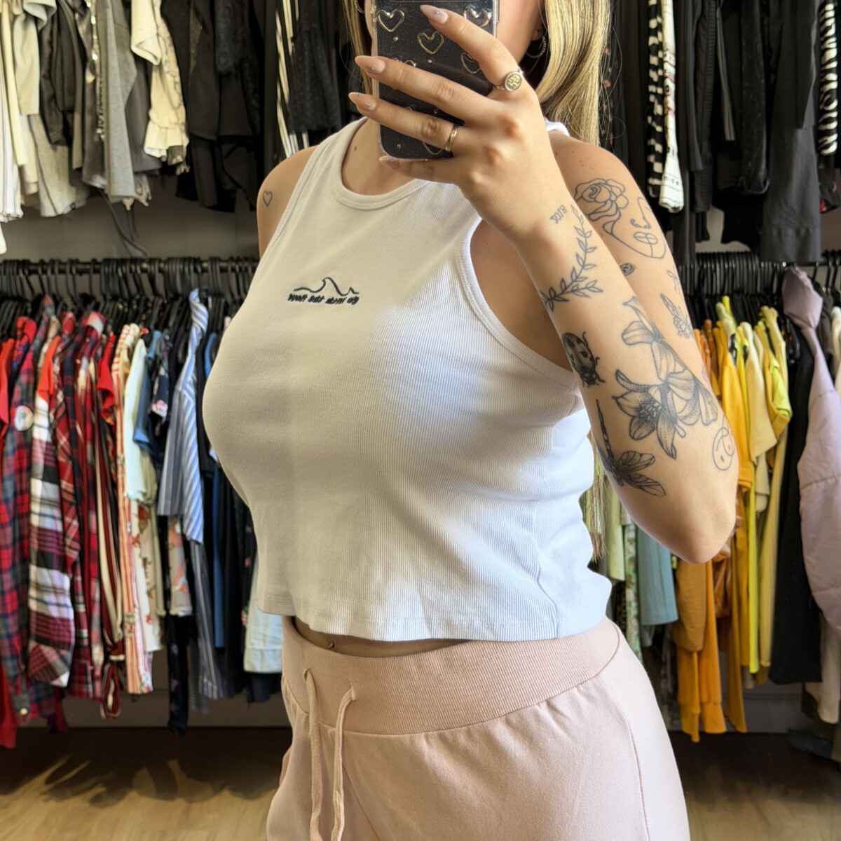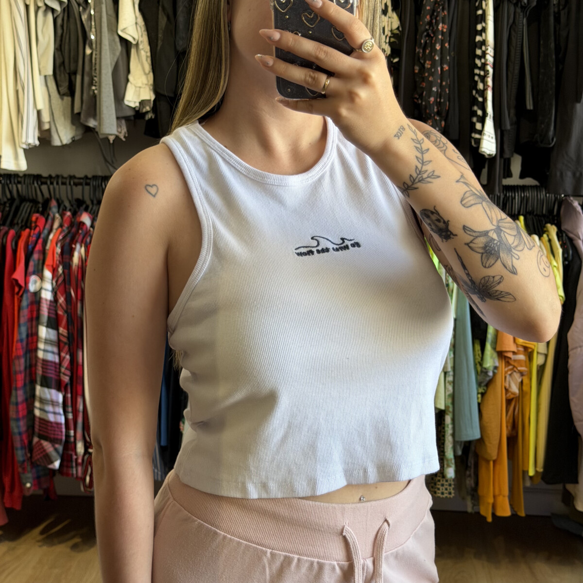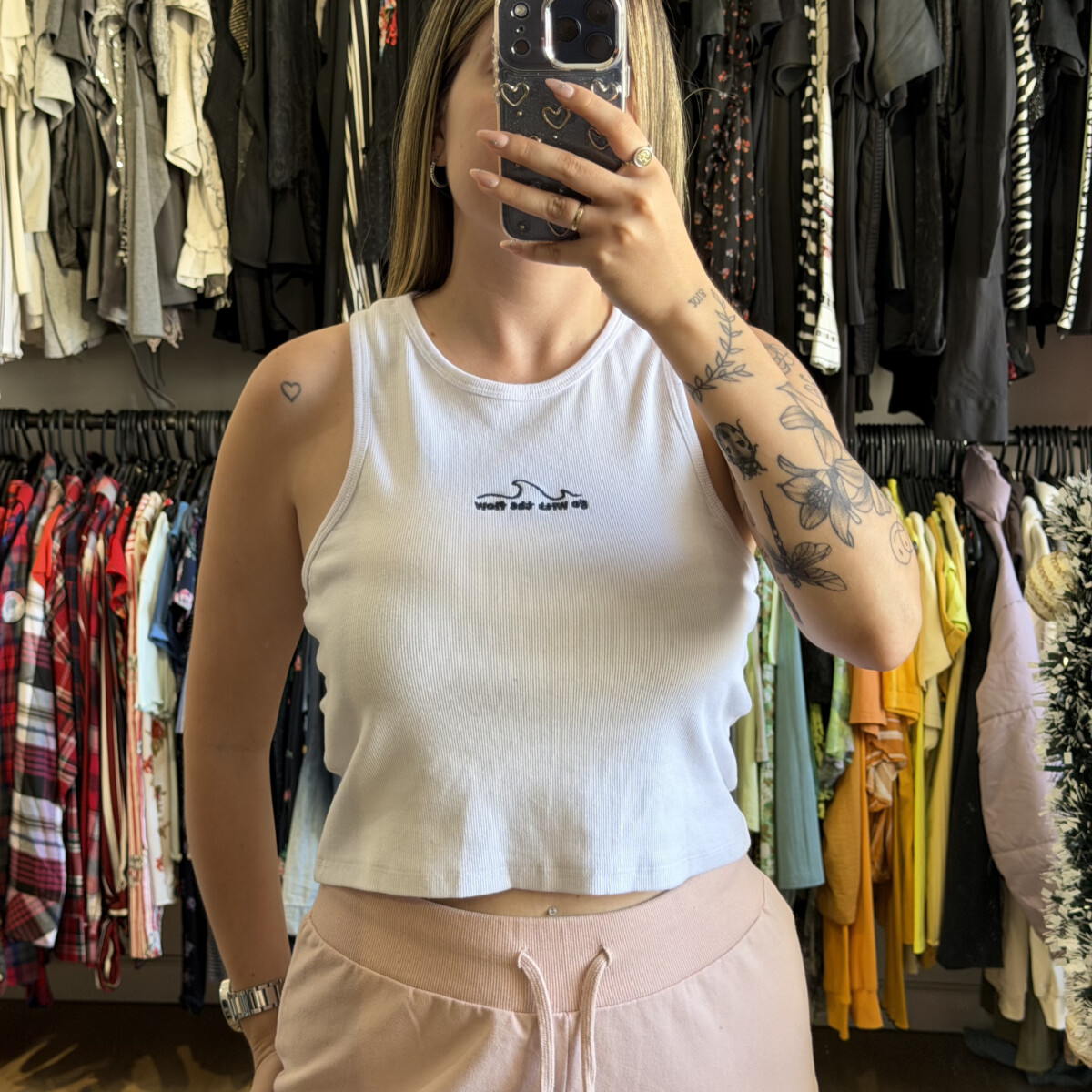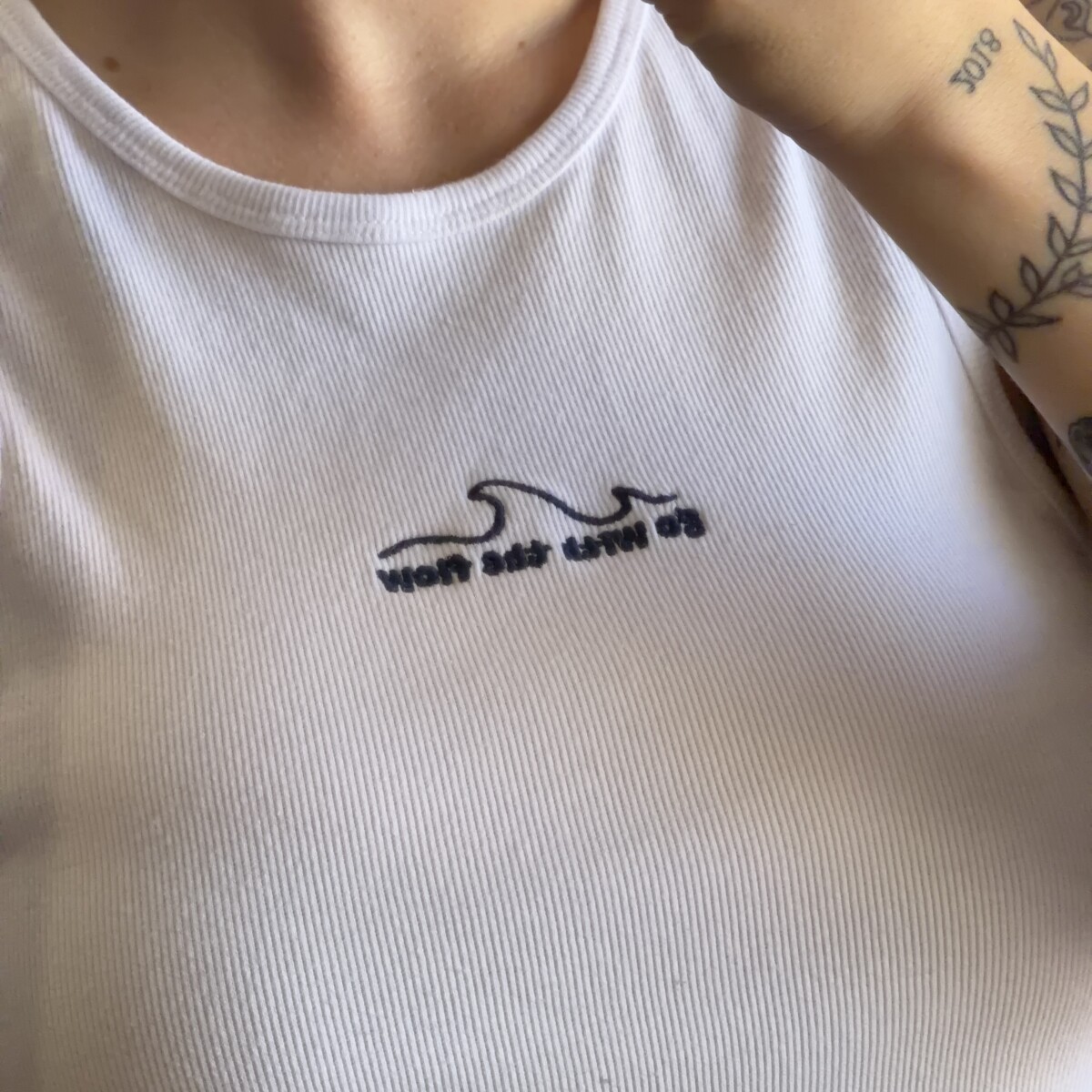 • Color blanco con bordado azul de ola y frase “go with the flow”