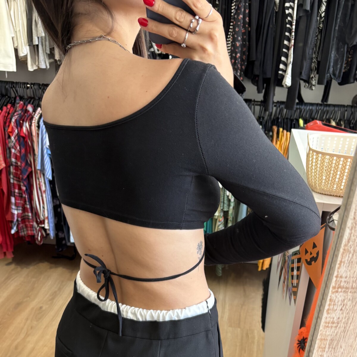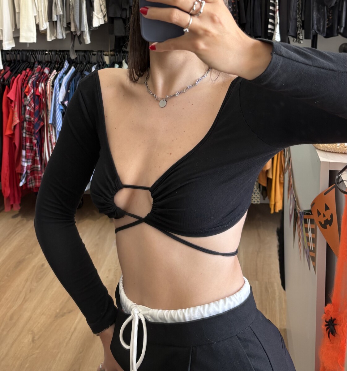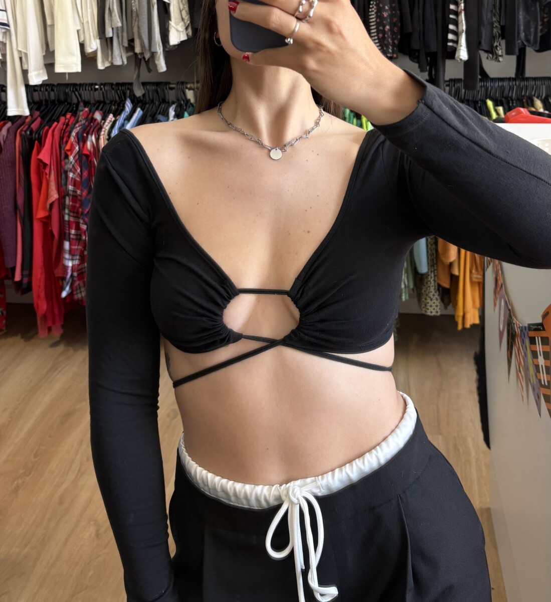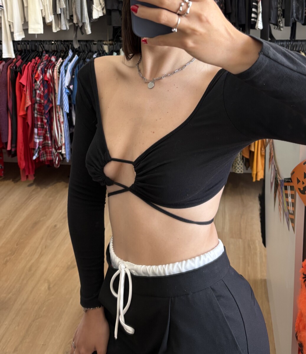 • Top negro con frunce atado adelante quedando en “circulo”