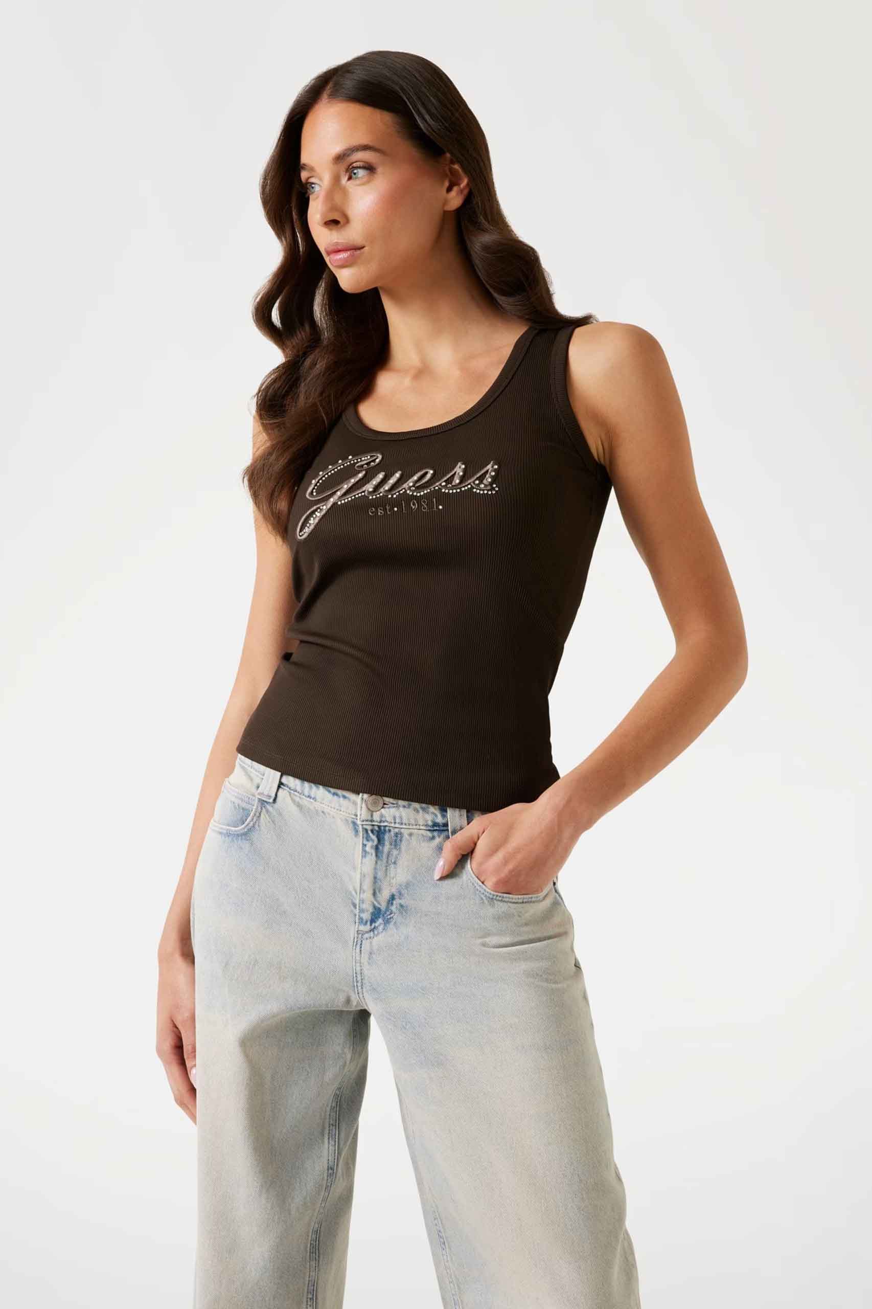 Descubre un estilo cautivador con este top sin mangas de tejido elástico. Su escote redondo aporta modernidad, mientras las letras bordadas del logo y los detalles de pedrería realzan su elegancia. Ideal para un paseo por la ciudad o una tarde relajada.
