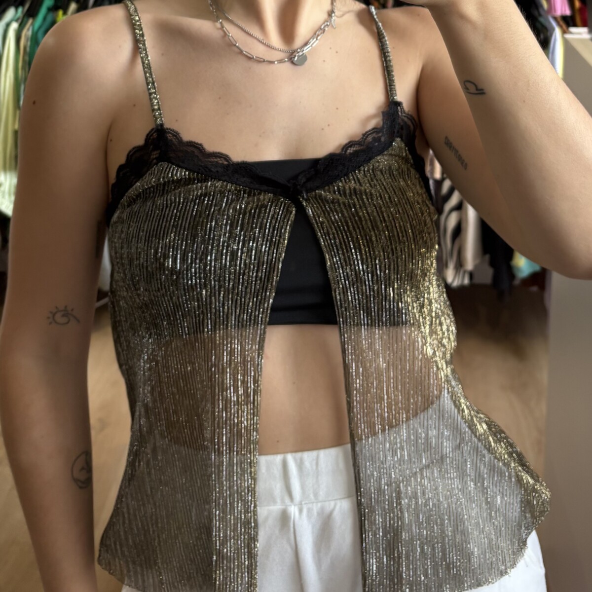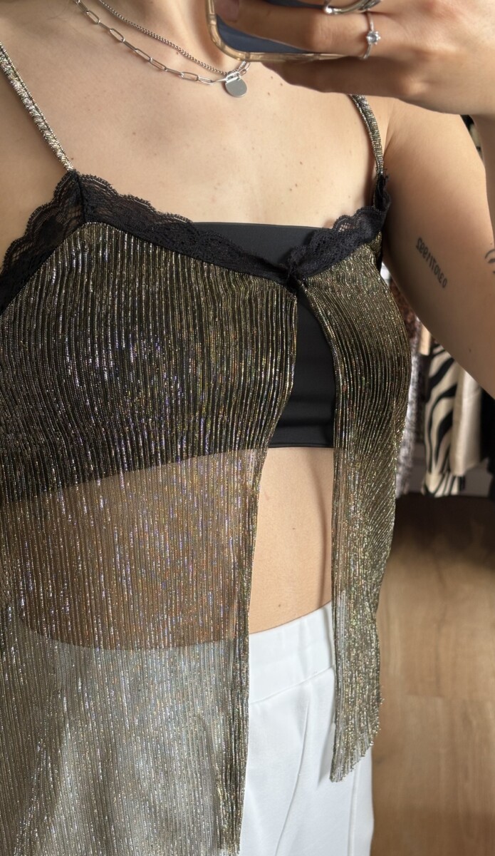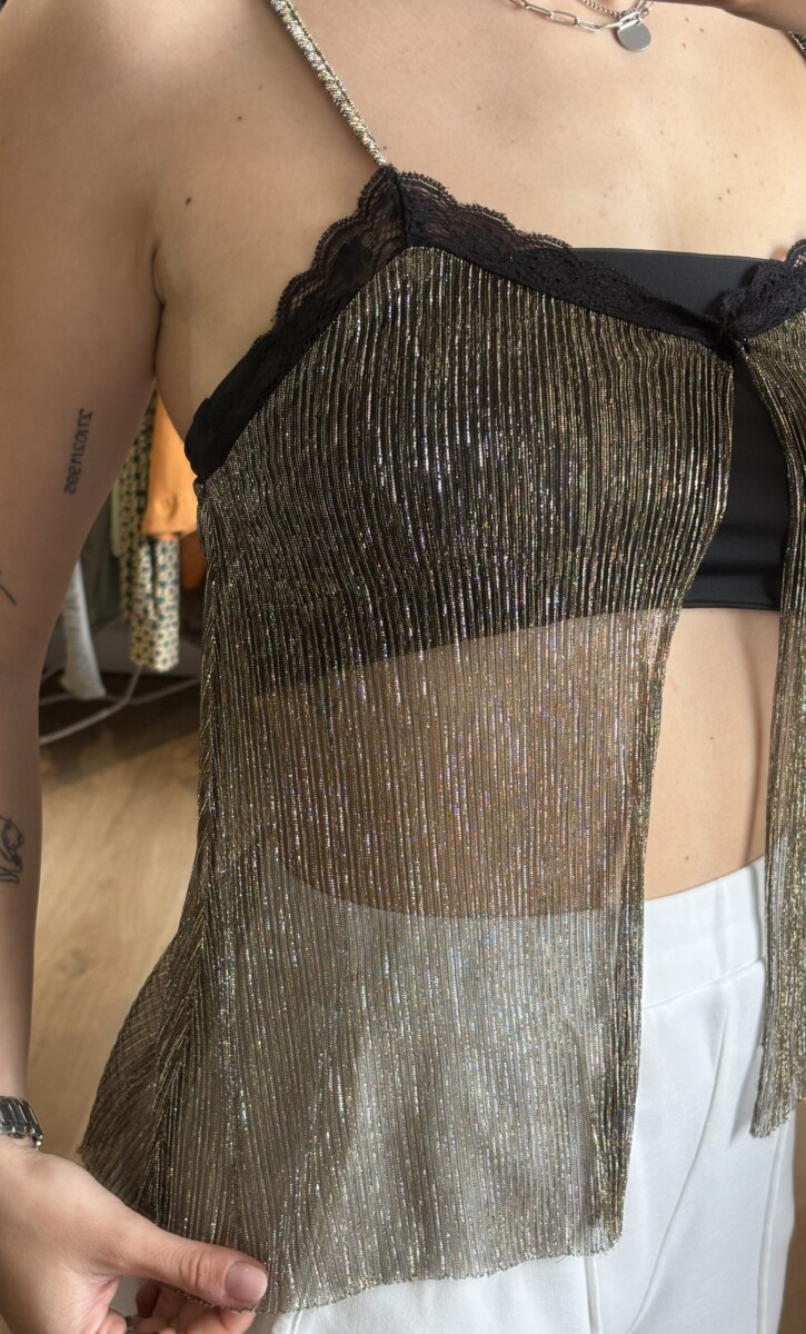 • Top marca Stradivarius dorado con brillos y encaje negro