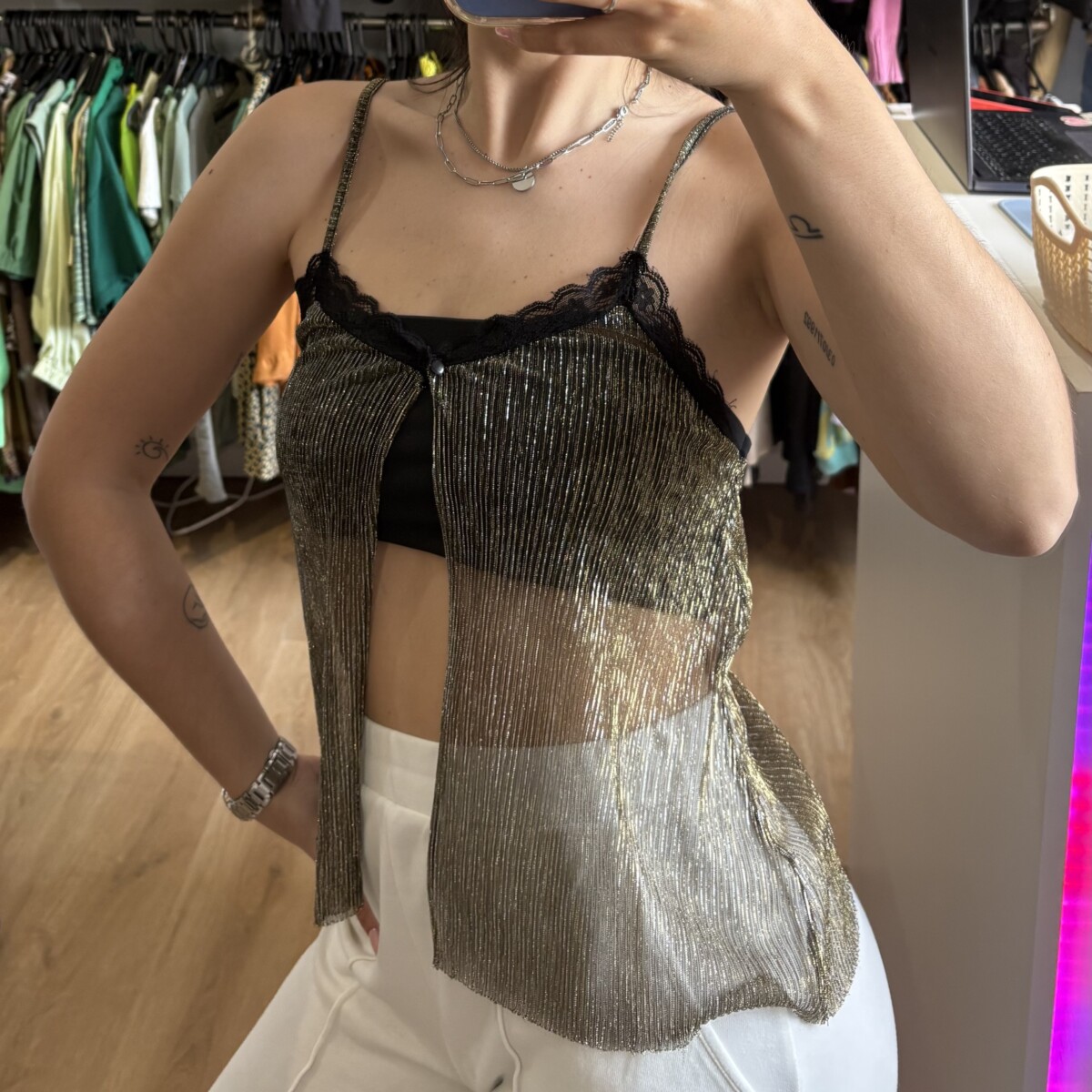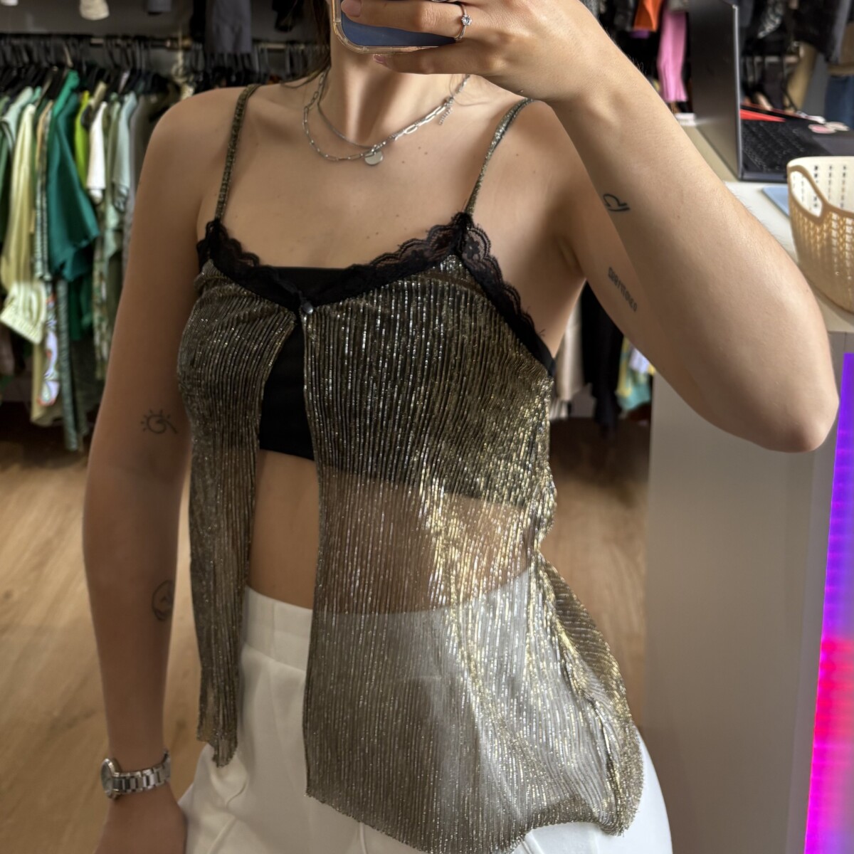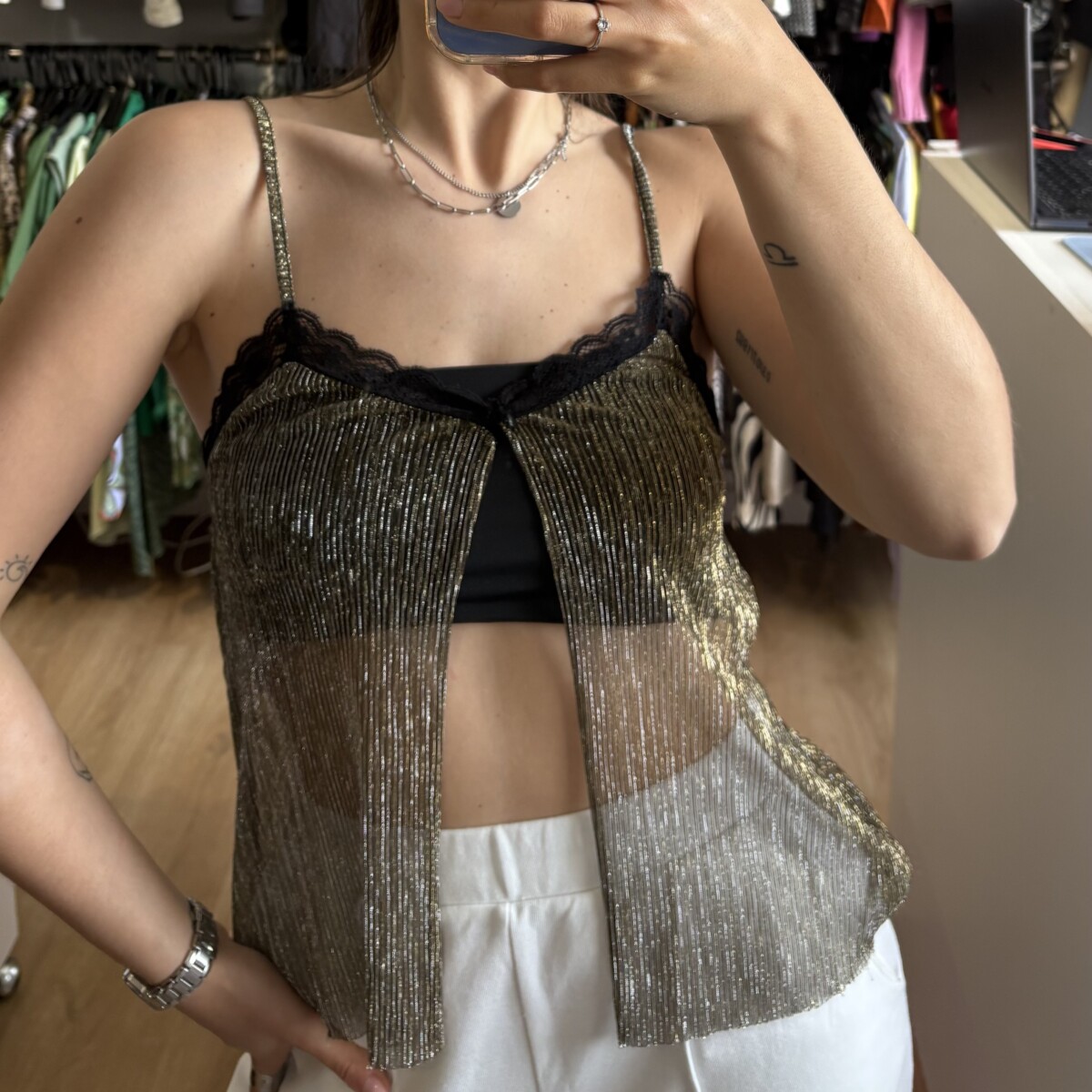 • Top marca Stradivarius dorado con brillos y encaje negro