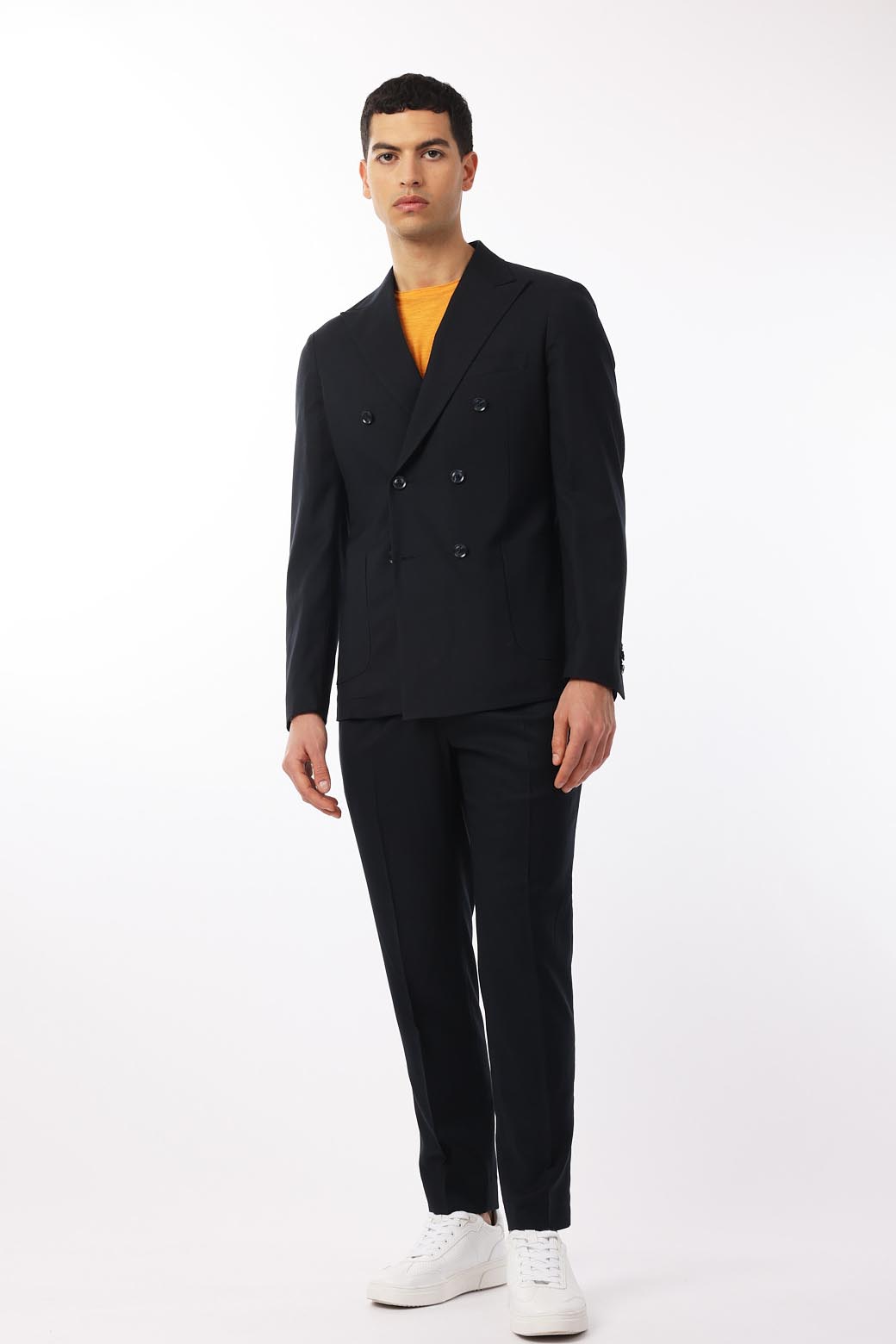 Traje clásico, chaqueta de doble botonadura con bolsillos delanteros y bolsillo en el pecho. Solapas clásicas.