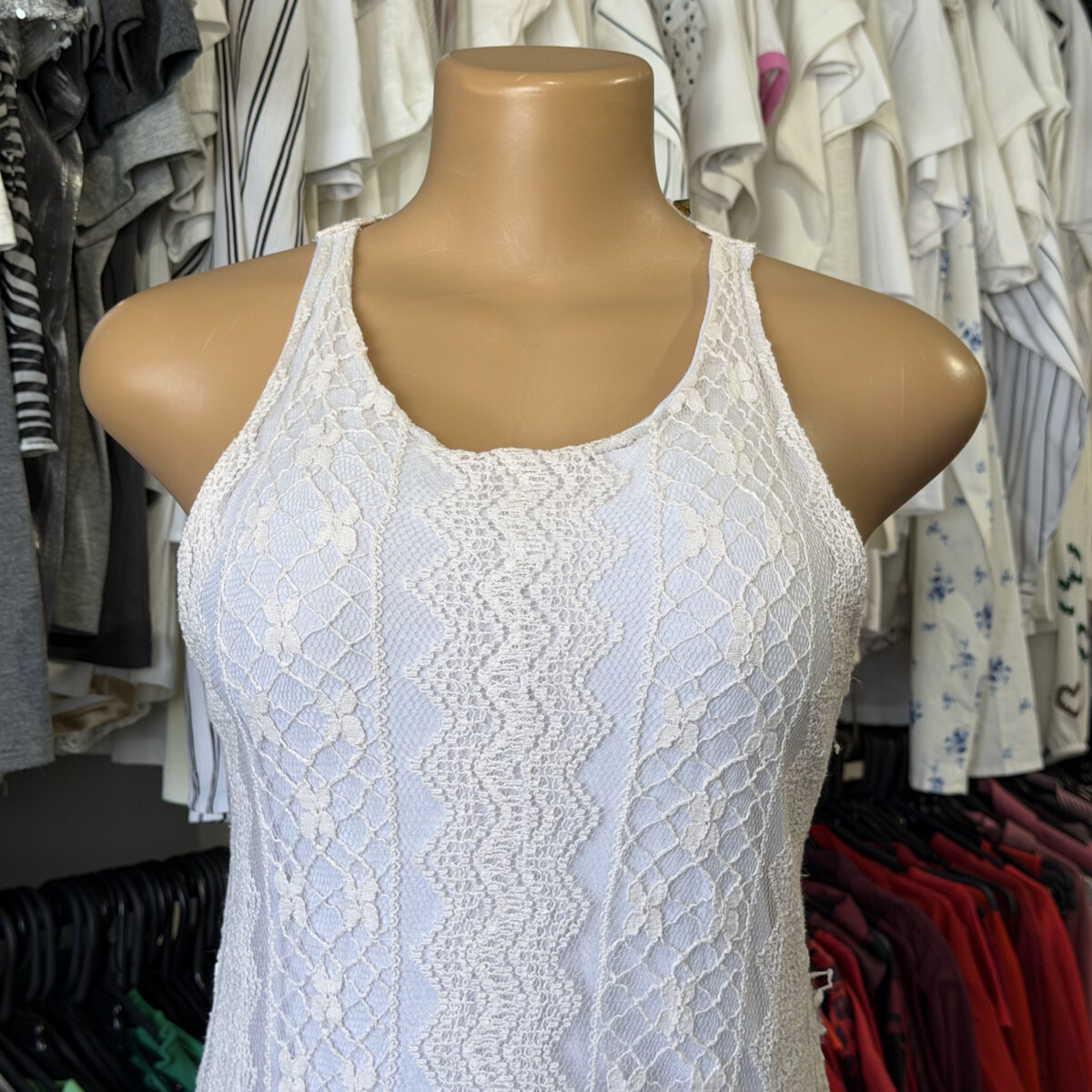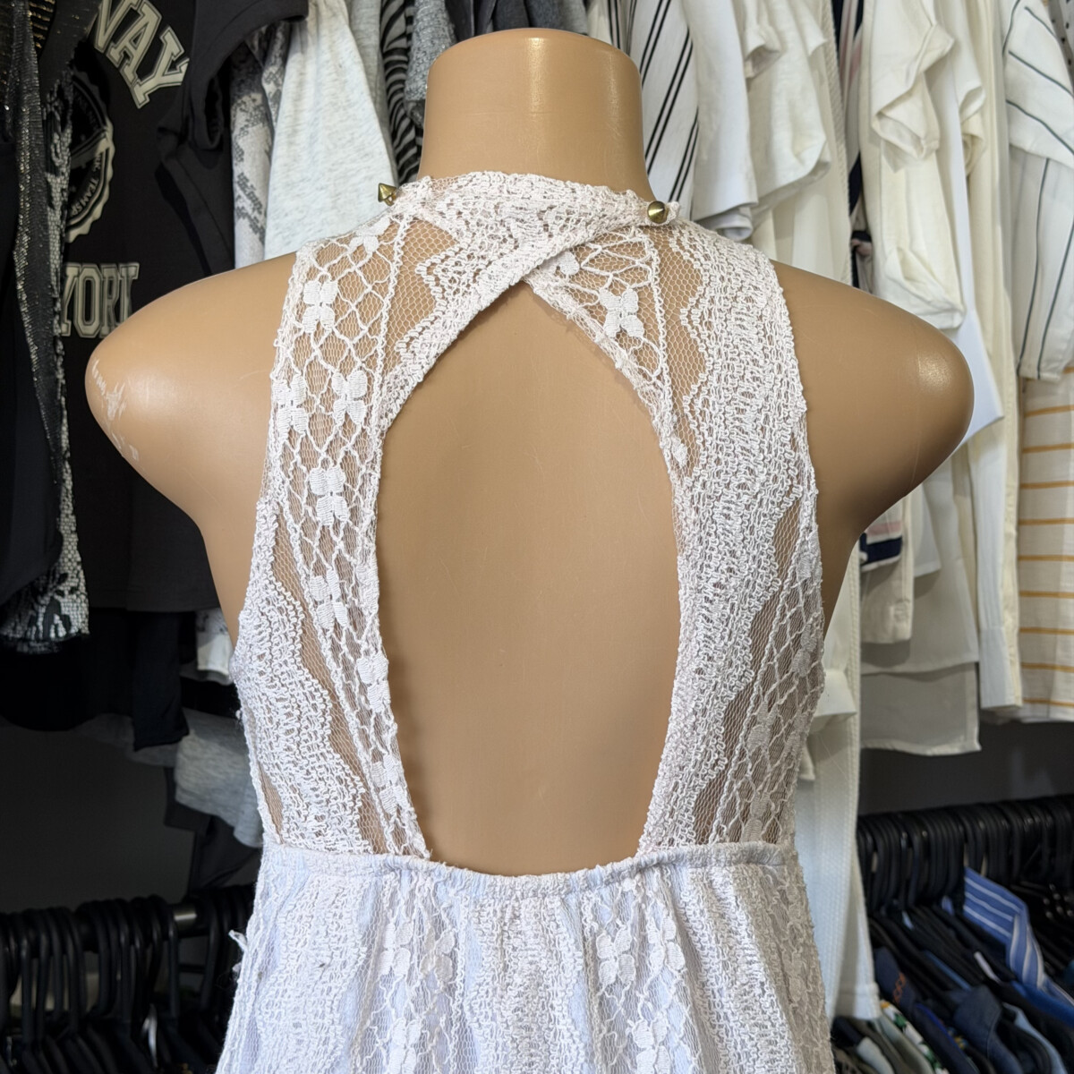 • Vestido blanco con calado tipo broderie superpuesto en color crudo