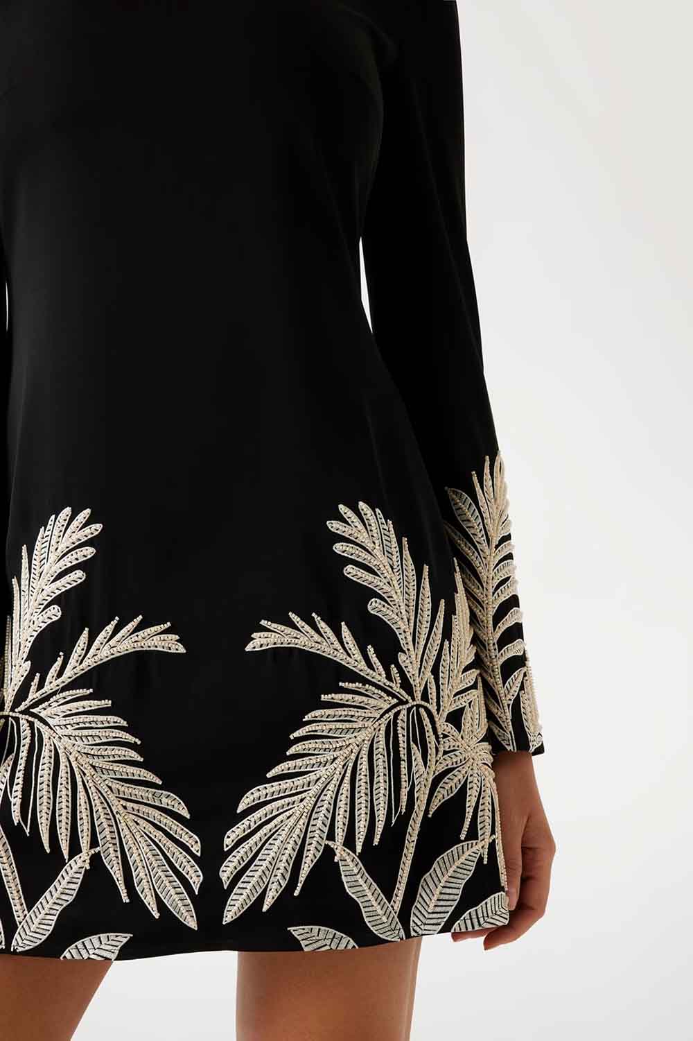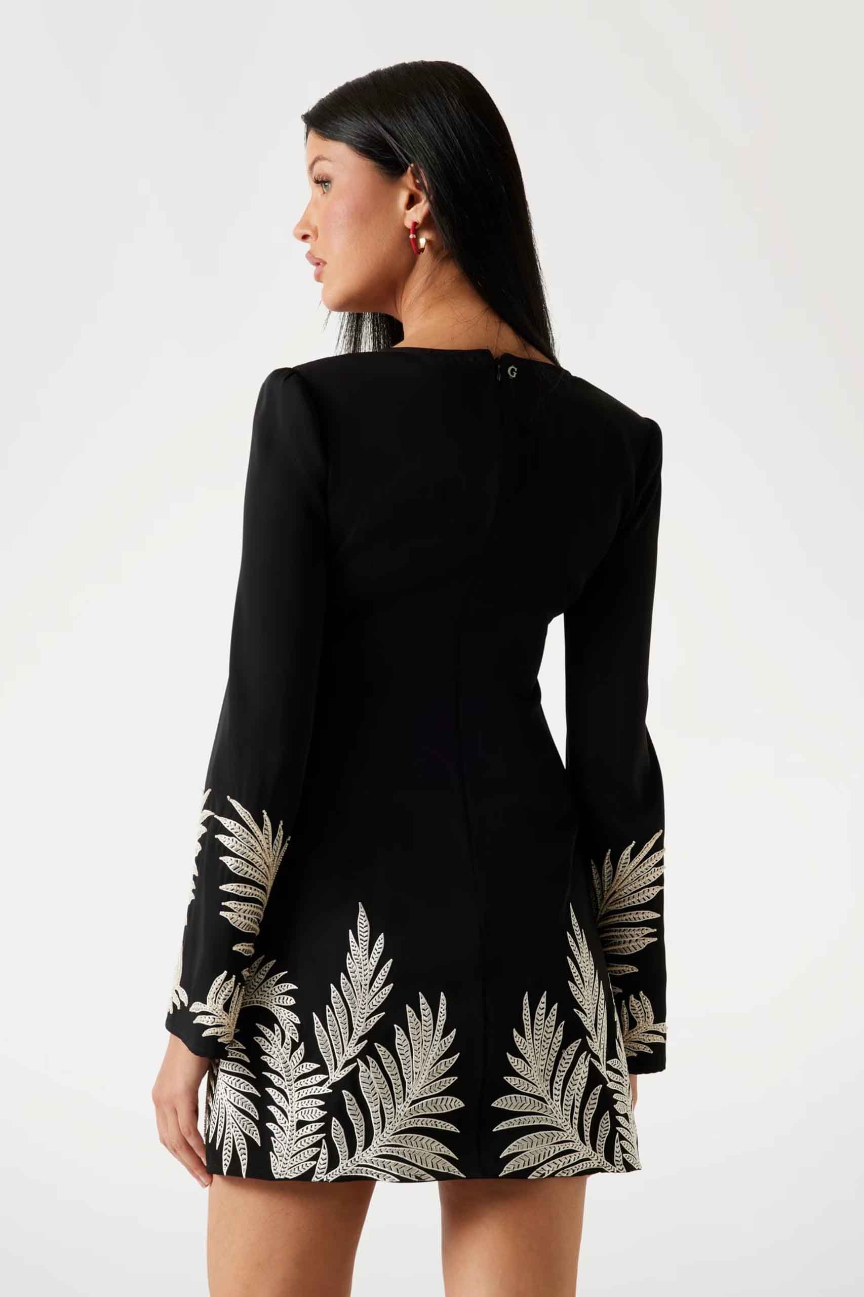 Deslumbra con estilo con nuestro vestido mini de crespón ajustado. El cuello redondo armoniza con las mangas largas abullonadas. Bordados decorativos en los puños y el bajo añaden sofisticación. Perfecto para una noche de fiesta, realza tus curvas con elegancia.